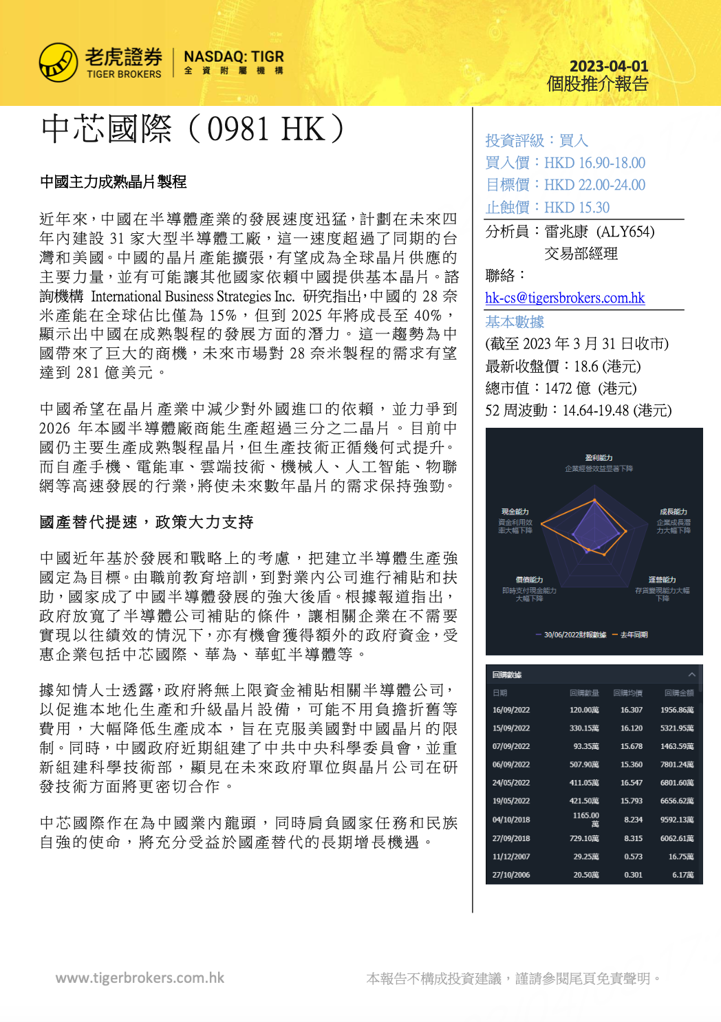 2023 年一季度,盡管中芯國際指引一季度收入環比將下降 10%至 12%,但以現價 22 年 P/E 不到 10 倍巿盈率,參考中芯 2022 年中芯回購價最低 15.36 最高 16.547 元,我們認為中芯 國際現處價值收集區間,在區間 16.90-18.00 收集,以回購最低價 15.30 止損部署長線投資。