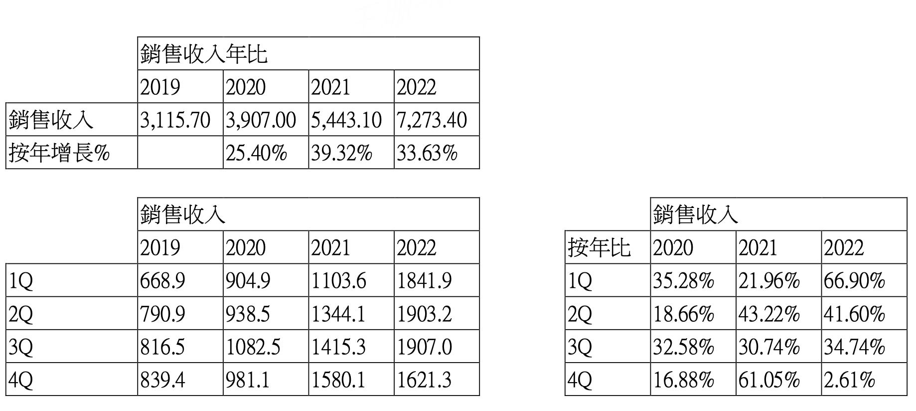 2019 年到 2022 年,中芯國際盡管經歷美國制裁、禁運、禁令、禁售等多方面打壓,期間 銷售收入依然保持強勁增長,年均複合增長率達 23.61%。