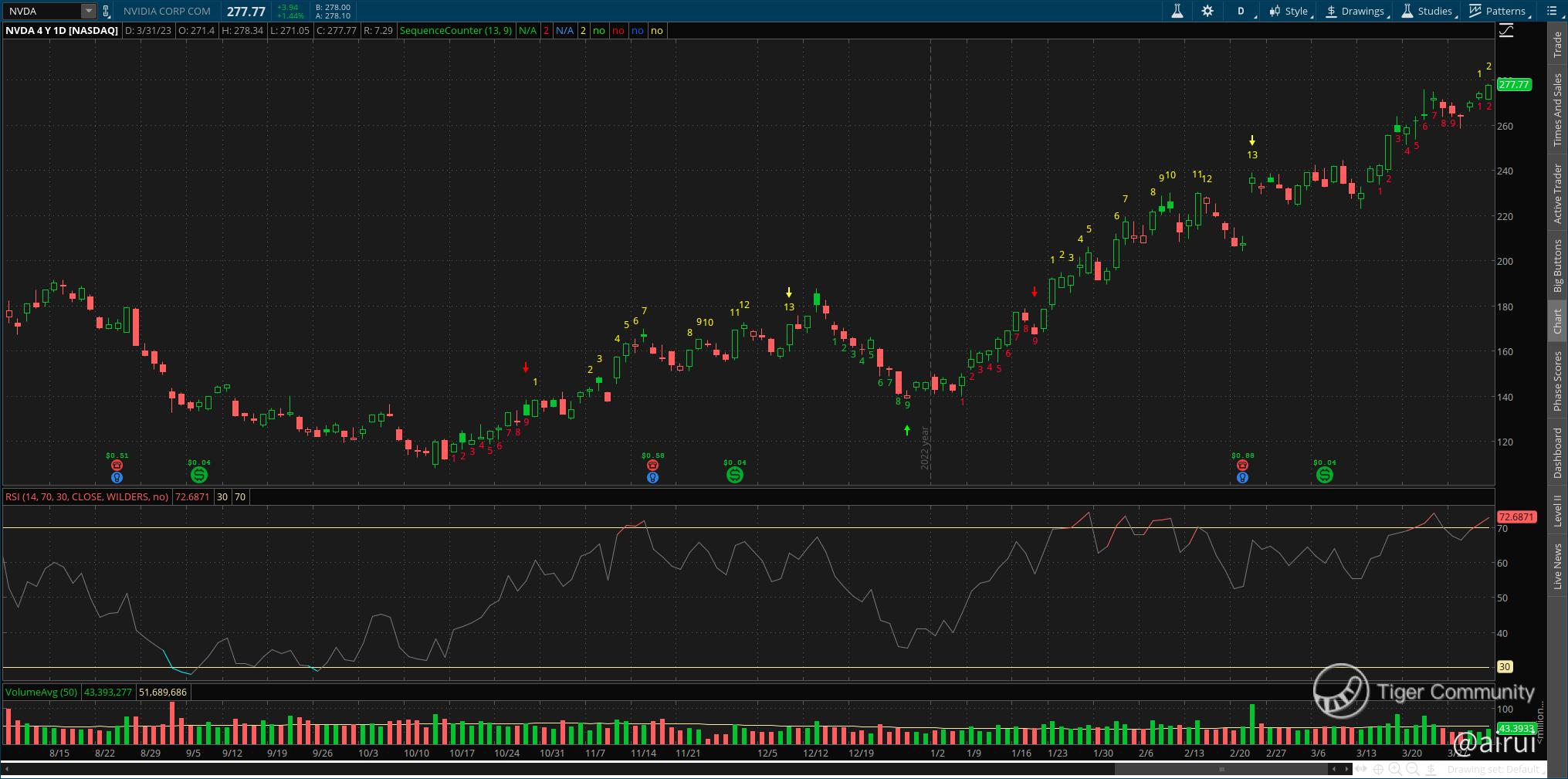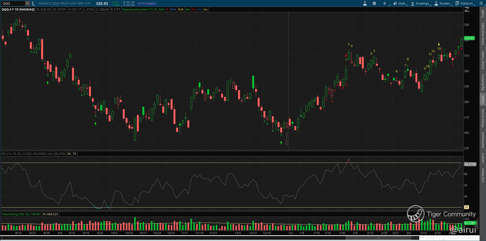 I still do not feel safe putting my money into buying stocks as I feel the market is too optimistic. I was expecting the stock market to correct more when the banking crisis unveiled, but the market was so resilient. Therefore, my plan is to mainly purchase Put Options when I see certain stocks or ETF are overbought and scalp some small profits during pullbacks. Some of the low-lying fruits are $NVIDIA Corp(NVDA)$ and $Invesco QQQ Trust(QQQ)$ as both their RSI are in the overbought (above 70)regions based on the the Day Charts below.