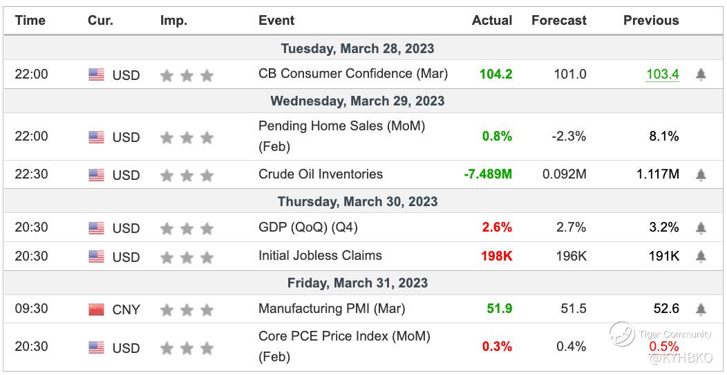 The table above details the critical economic data for the week ending 31 Mar 2023. here are some observations: