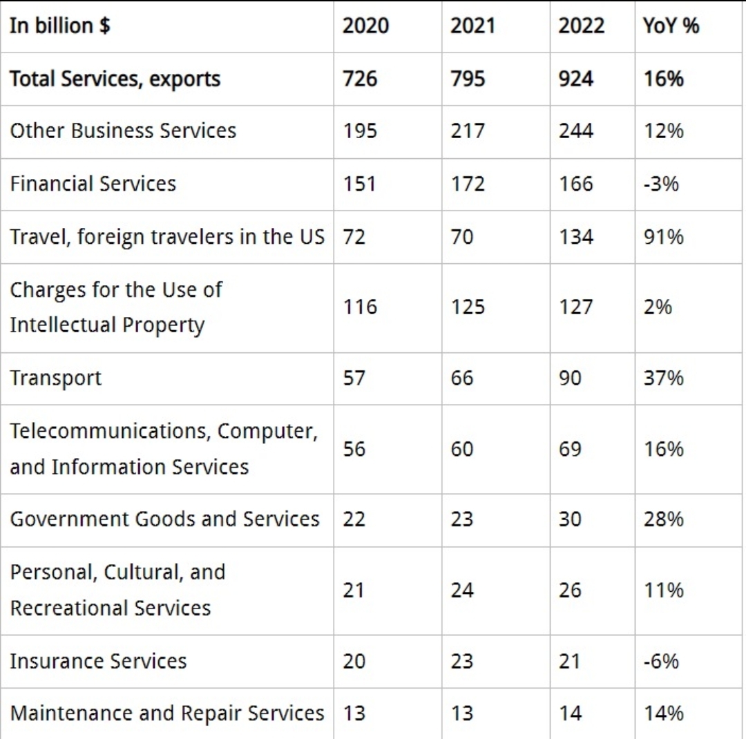 The top four categories account for 73% of services exports. Travel (#3) jumped by 91% year-over-year, as travel restrictions were lifted. This is spending by foreign travelers in the US, and includes travel for personal, health-related, and educational purposes; business travel; and for seasonal/short-term work.