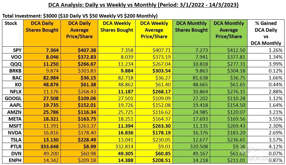 (3) The average cost/share between Daily 🆚 Weekly DCA plan is not significantly different but it was a lot higher for Monthly DCA plans. By using a Daily as compared to a Monthly DCA plan, we could have gained 4.12% more😉