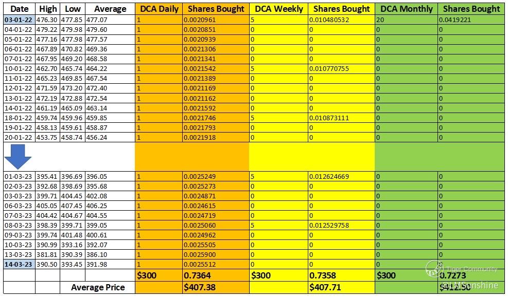 🤔💭: During a 🐻bear market, would there be a difference to my average cost price/share if I did DCA Daily 🆚 Weekly 🆚 Monthly❓