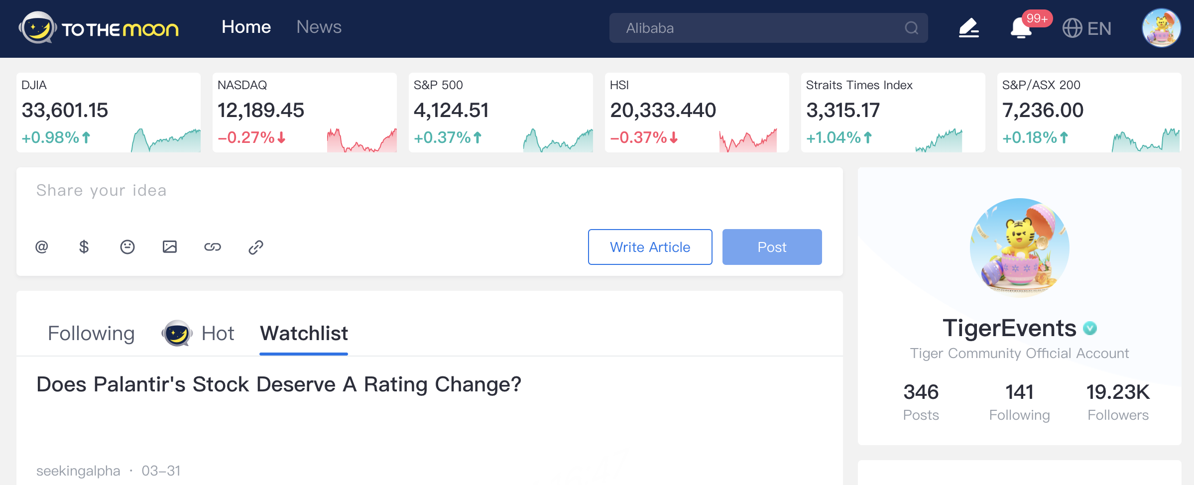 Thanks for using Tiger Trade, We're thrilled to be a part of your investing journey. We're excited for you to join Tiger Community. Tiger Community's goal is to build a vibrant community of investors where users are able to share their thoughts on markets and post comments.