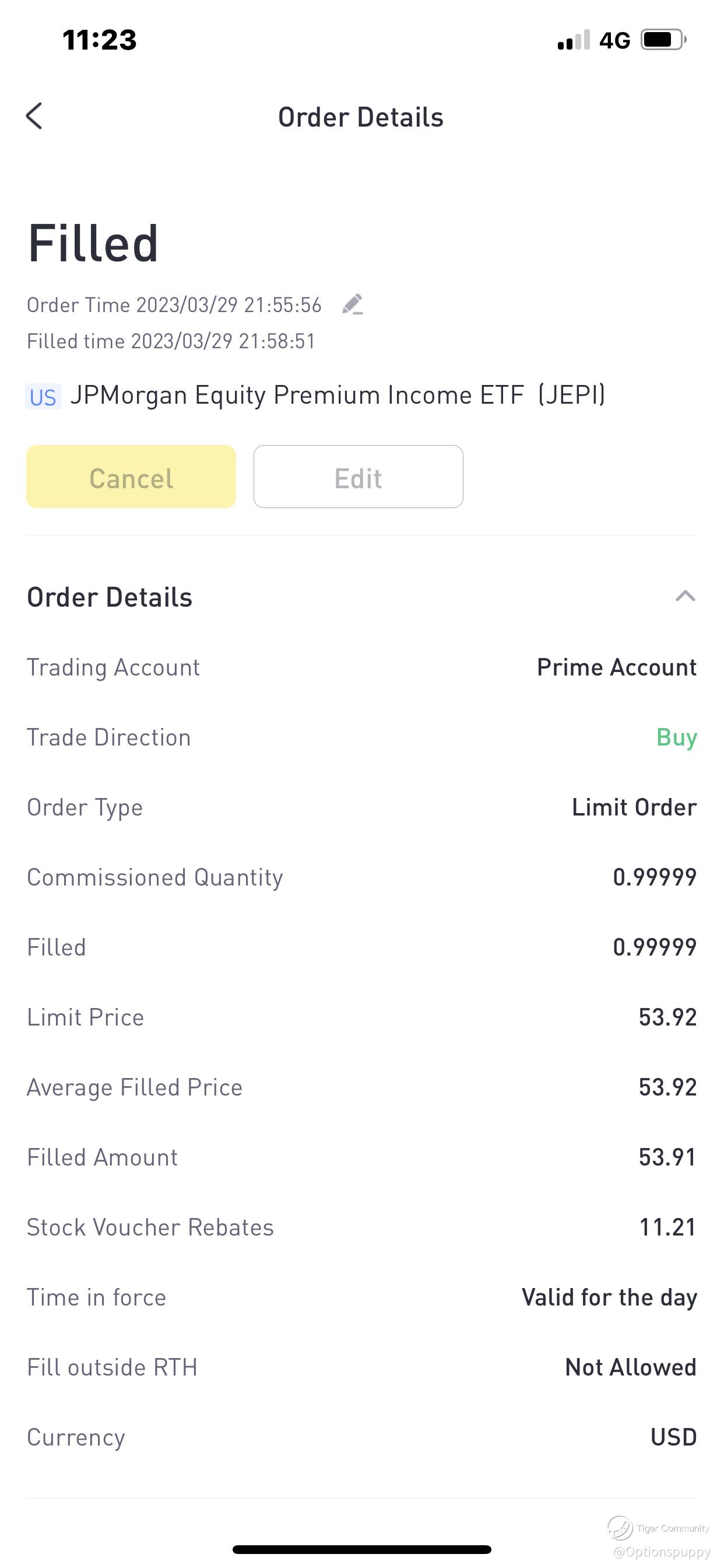 On March 30th, I purchased 0.99999 fractional shares of the JEPI ETF by JP Morgan at a price of $53.92 on Tiger Brokers. My purchase was motivated by my desire to accumulate 100 shares of the ETF so that I can sell covered call options.