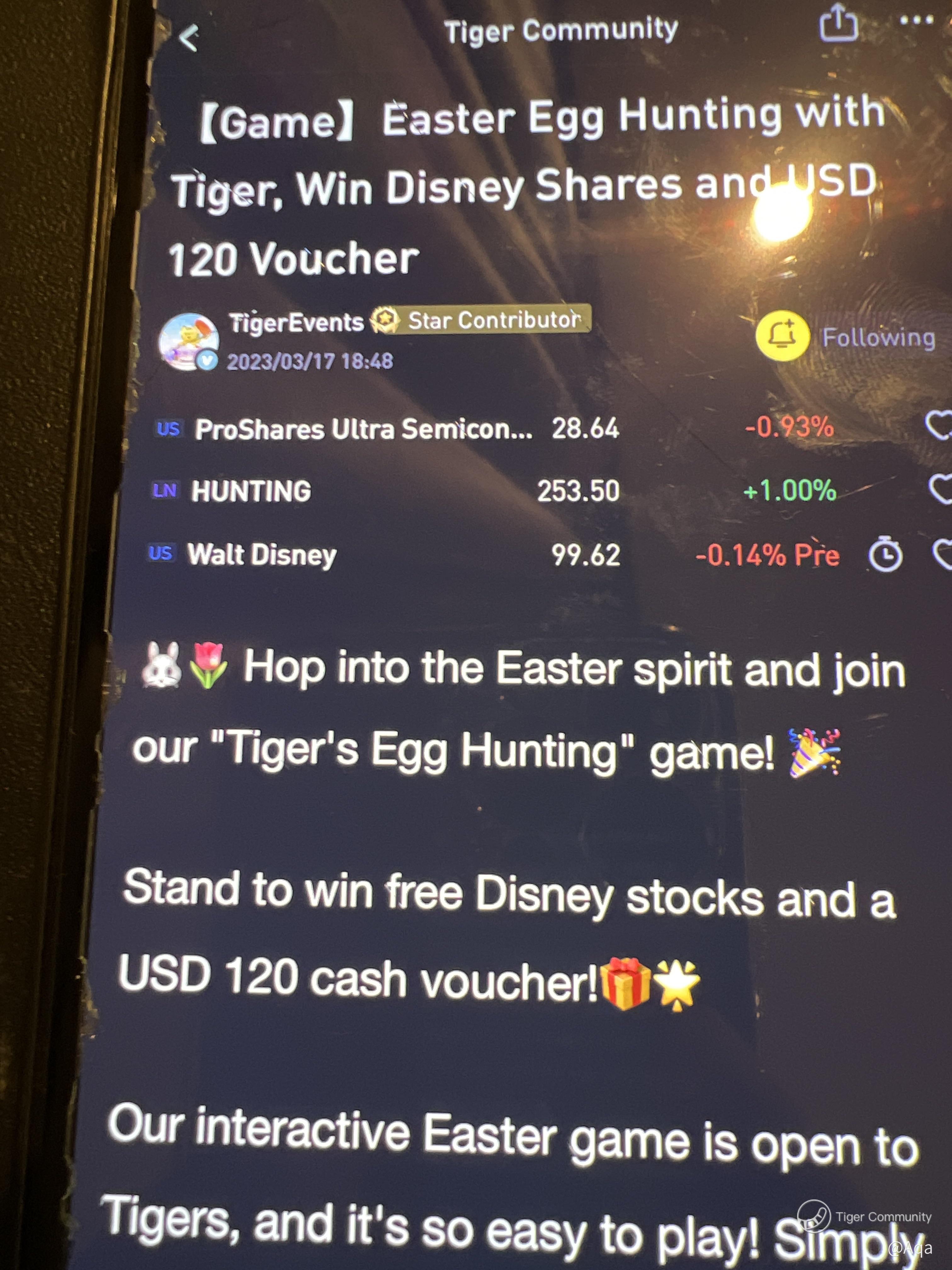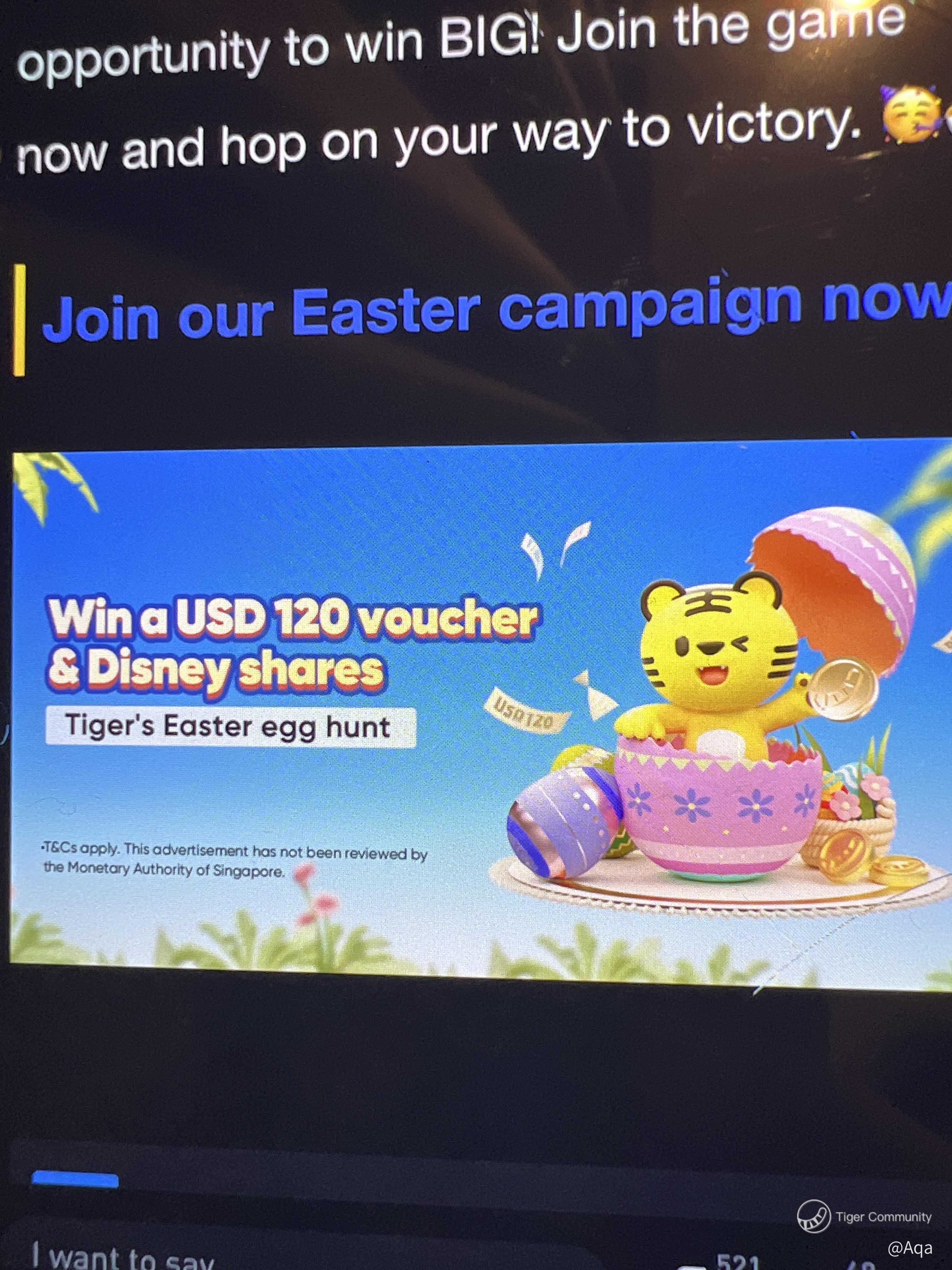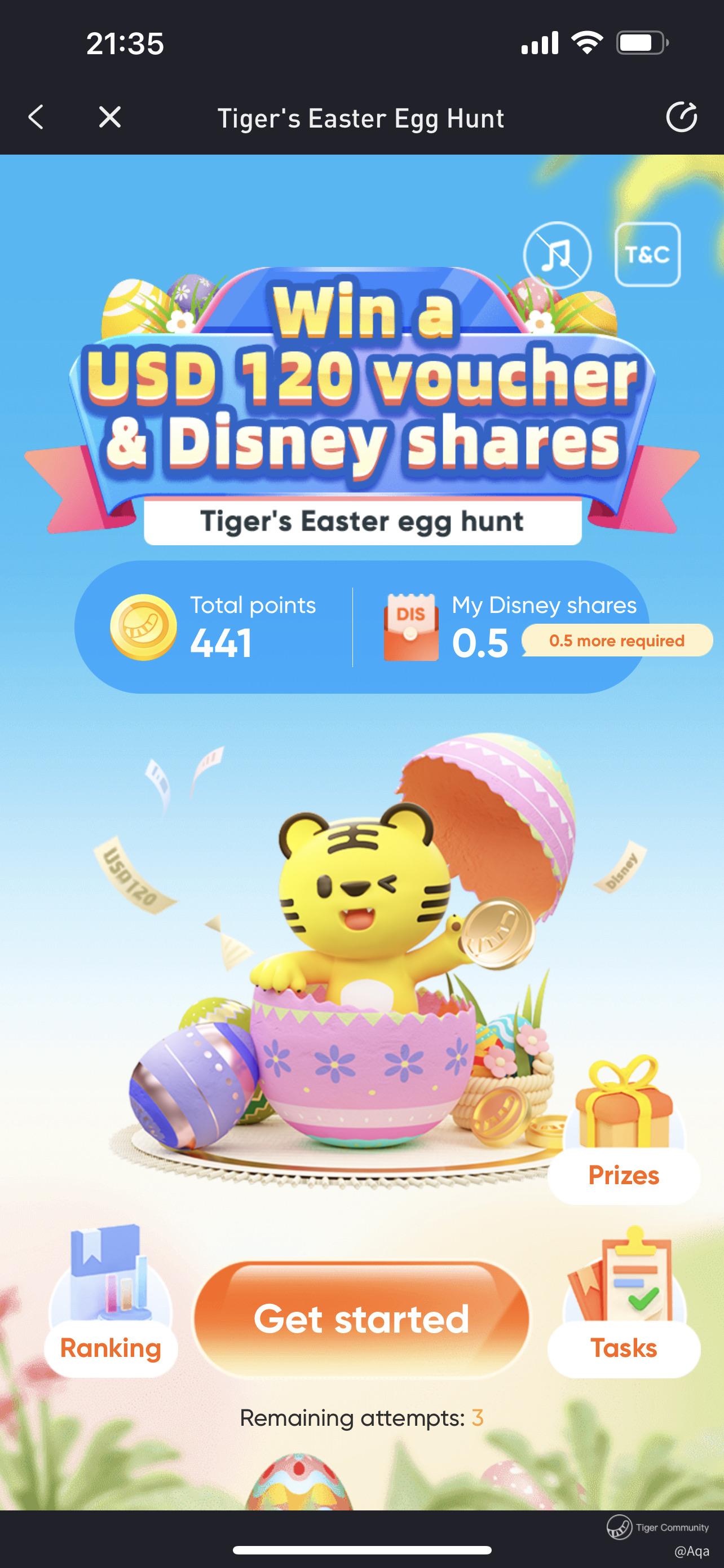 12 April Thanks @TigerEvents for this Easter Egg Hunting game. Can you please send me a Disney egg so that I can redeem for a Disney share @TigerWire I also need many many of the Eggs that give me cash vouchers and Tiger points. Just a few more days to go before this good game ends. Calling all my friends, 'Don't miss!'