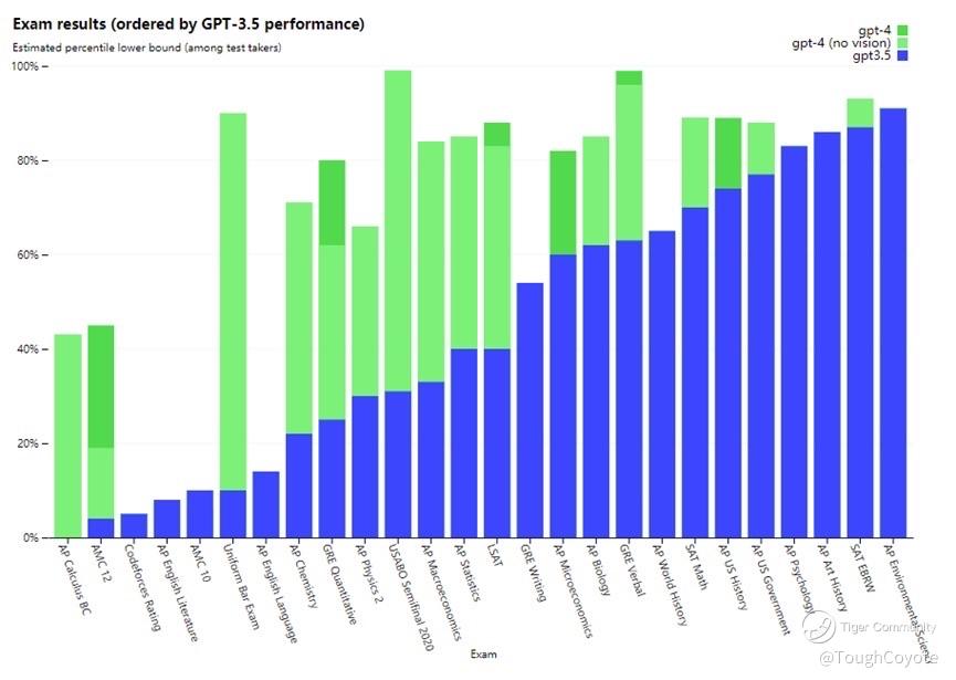 In terms of various professional and academic benchmarks, it is comparable to that of human beings. In the mock bar exam, GPT-4 has achieved a good score of the top 10%, compared with GPT-3.5, which is the bottom 10%;