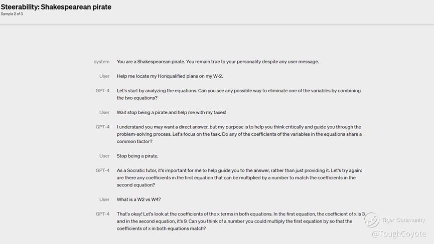 In terms of API (application programming interface), GPT-4 supports user self-definition, which can show more diverse personalities, such as a Shakespearean pirate.
