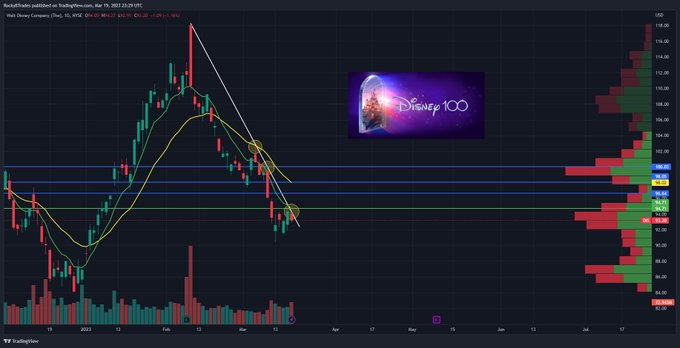 $Walt Disney(DIS)$ I don't think a $100 psych re-test is out of the picture shortly on this one.$DIS is testing this Daily Downtrend/8-EMA.