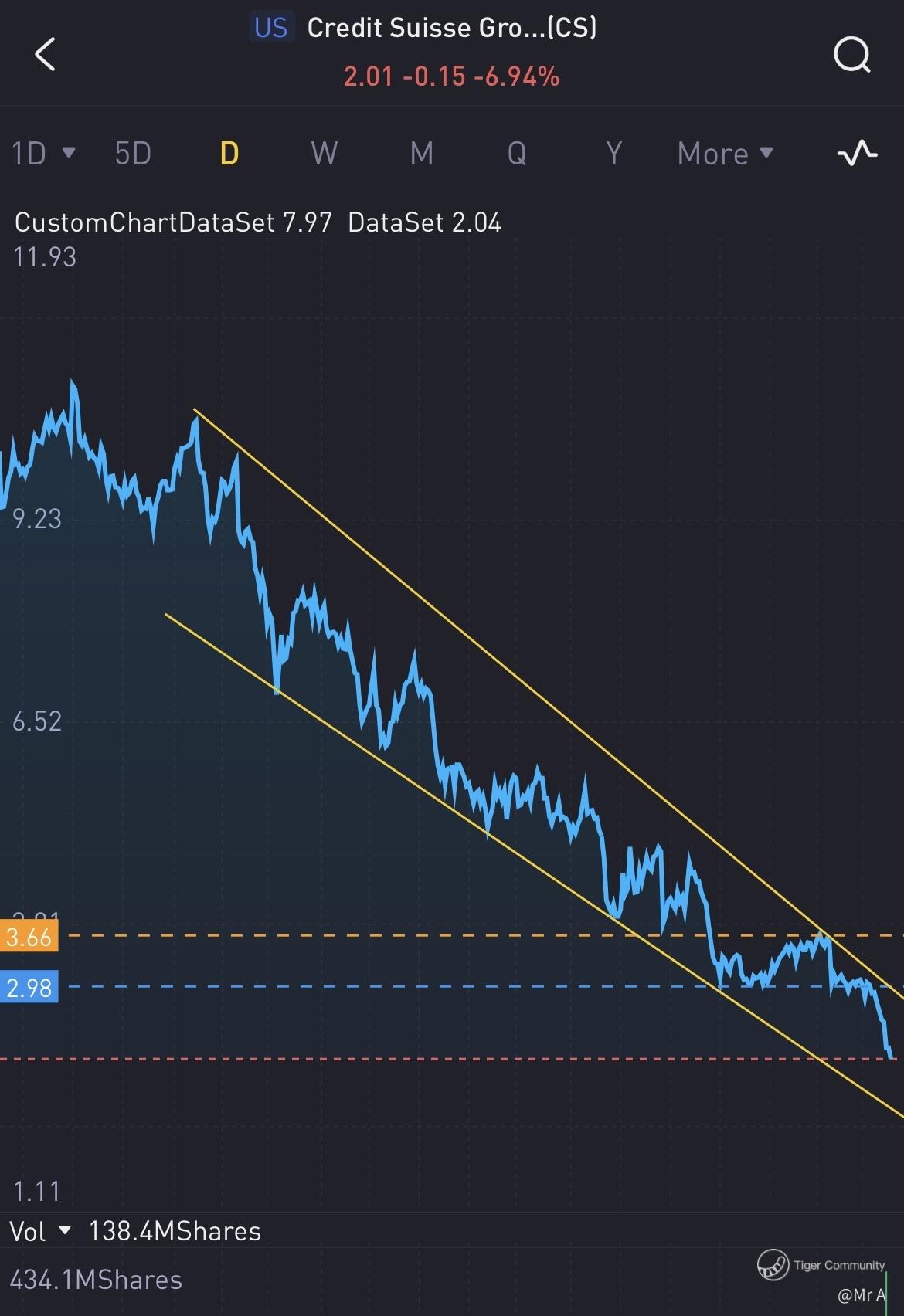 $Credit Suisse Group AG(CS)$ Low and Lower. Looks at the chart, Credit Suisse Group continue to go lower and lower. Some might wish to catch the falling dagger, hoping to catch a rebound.