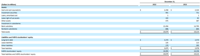 Assuming for the sake of discussion that they currently have available cash and cash equivalents of $2.258 billion, that would imply that 68.4% of their $3.3 billion long-term debt's claim is covered by cash. The 68.4% is even before the actual operating entities and other significant assets are included in the valuation of their assets. This would seem to indicate SVB Financial Group notes may get a full recovery under a Ch.11 reorganization plan.