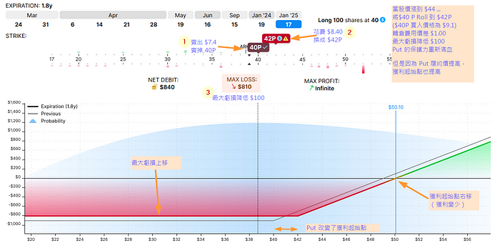1️⃣假設...數週後股價漲到 $44,我們已經透過『順手撈錢』取得一定獲利,此時我們 Roll put,將原來的看跌期權履約價從 $40 轉倉到 $42。
