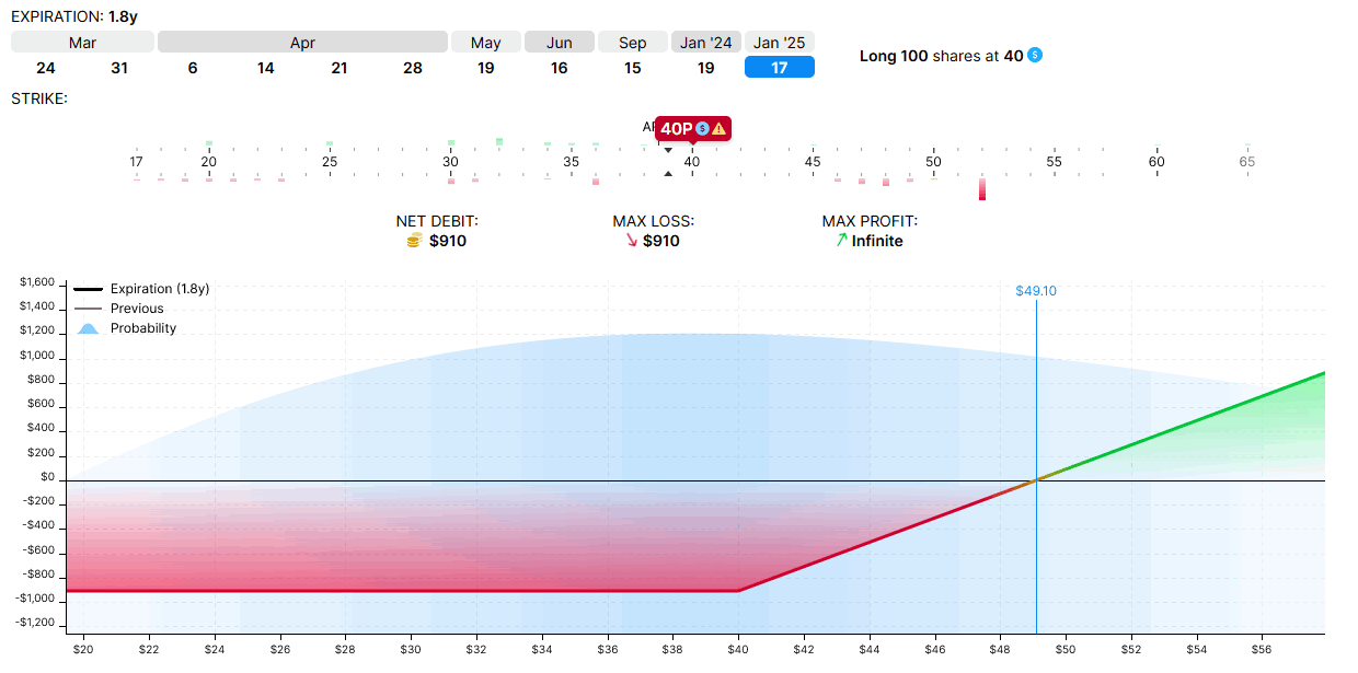 然後我們把股價 (入股成本 $40)加一起看,當最終將 Put 的履約價轉倉至 $50 後,既然購買 Put 的成本與當初買 Put 的成本大約相同,這個[持股成本]與[合約履約價]的價差($50 — $40 = $10),不就相當於我們創造了 $1000 的價值!