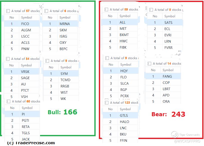 The bullish setup vs. the bearish setup is 166 to 243 from the screenshot of my stock screener below pointed still a negative market environment.