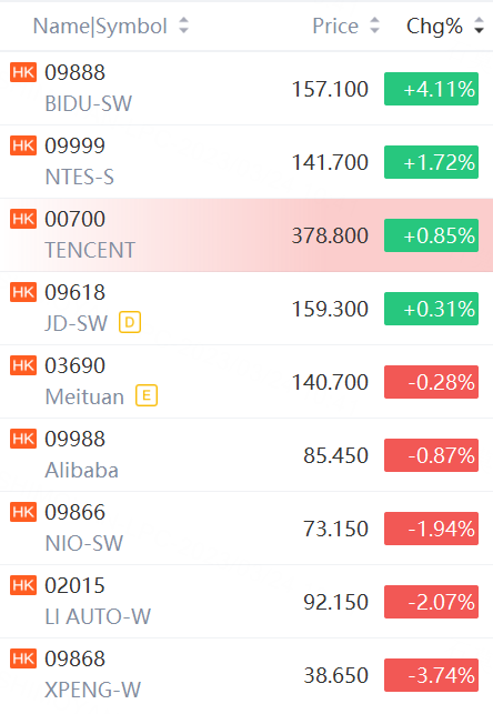 HSBC tumbled 3.5 per cent while Bank of China (Hong Kong) eased 0.2 per cent to HK$25.45. Country Garden dropped 2.6 per cent to HK$2.26 and China Resource Land weakened 1.7 per cent to HK$35.25. Alibaba Group Holding dropped 0.87 per cent and JD.com gained 0.31 per cent. Baidu rose 4.11%; XPeng fell 3.74%.