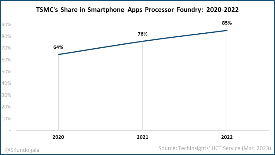 TSMC gained share in the smartphone apps processor foundry market again. Apple, MediaTek and UNISOC relationships and increased sourcing from Qualcomm helped. TSMC outperformed the market in units. Samsung's share reached its lowest in 7 years. $Taiwan Semiconductor Manufacturing(TSM)$