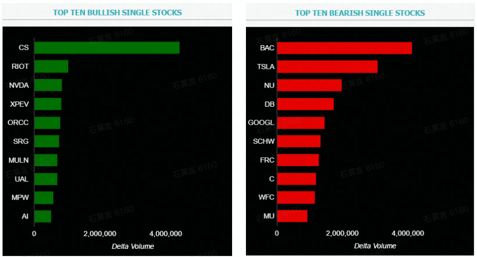 This report shows stocks with the highest volume of bullish and bearish activity by option delta volume, which converts option volume to an equivalent stock volume (bought or sold).