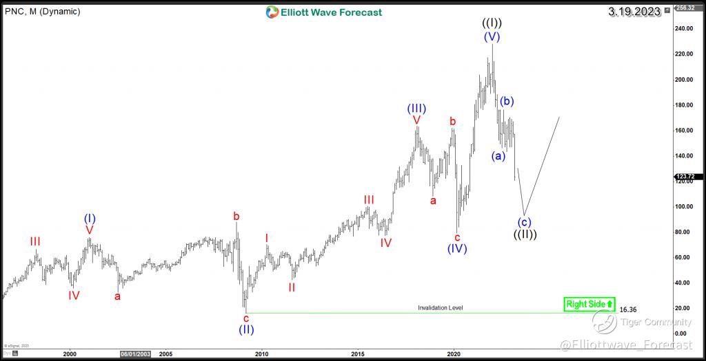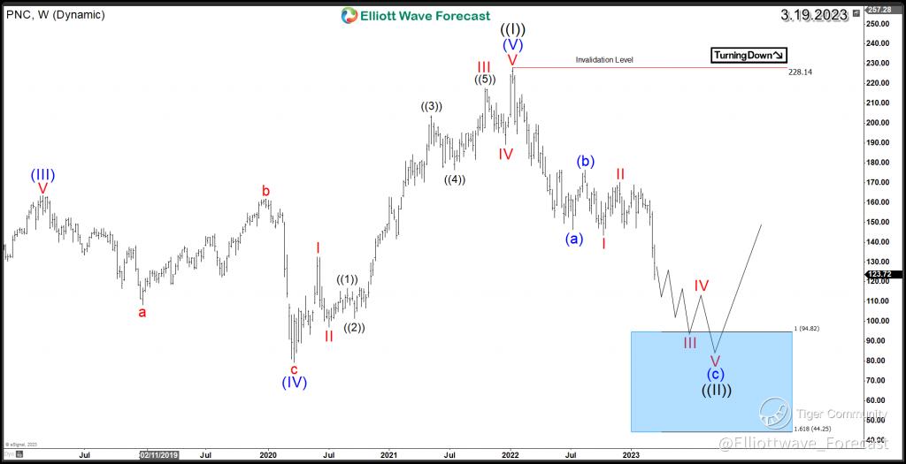 PNC Financial Services NYSE (PNC) is an American bank holding company and financial services corporation based in Pittsburgh, Pennsylvania. The stock is currently down 45% form all time highs. Investors are looking for clues into the current decline to prepare a plan for the next move. We’ll use the Elliott Wave Theory to define the technical structure and understand the potential path.