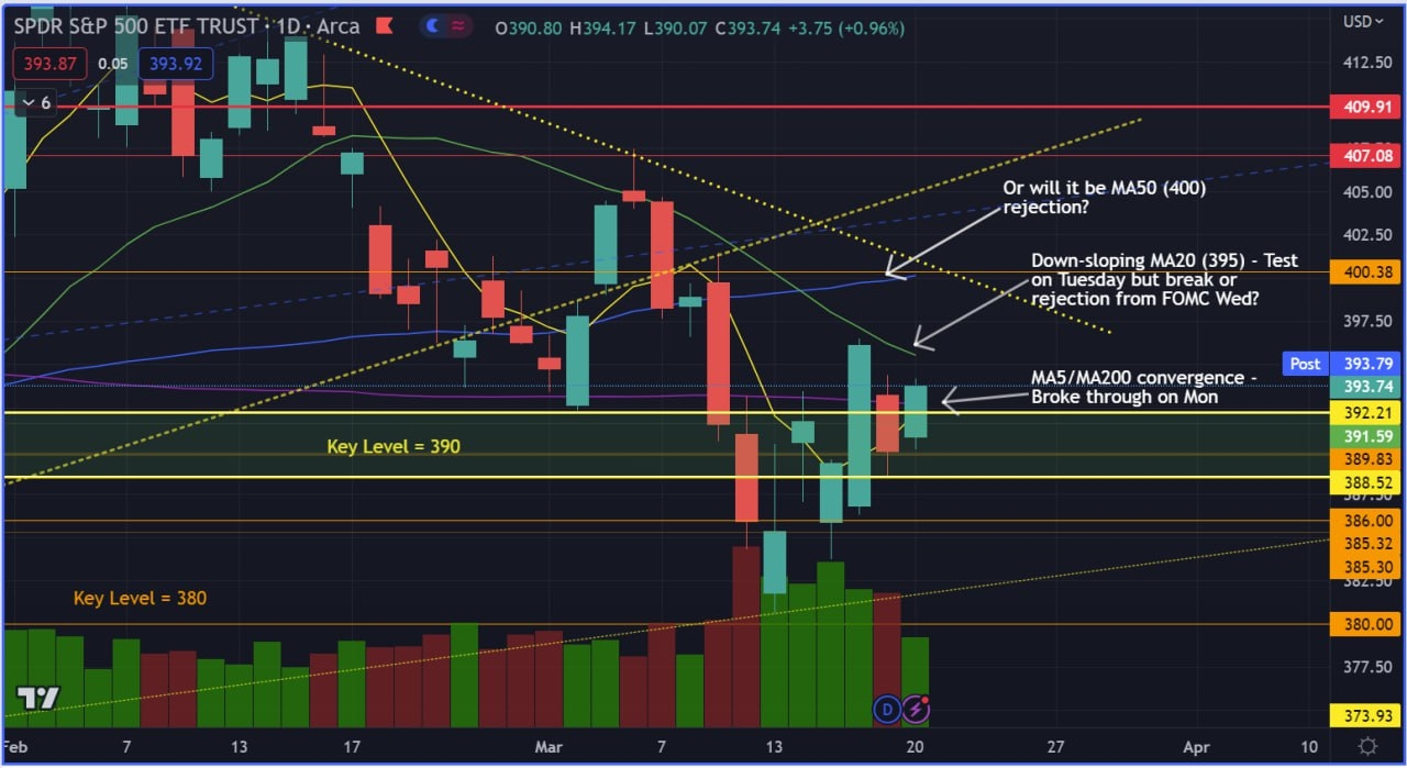 - Tuesday will see MA5 (yellow) and MA20 (green) coming together very closely (preparing for a Wed post-Powell cross or divergence)