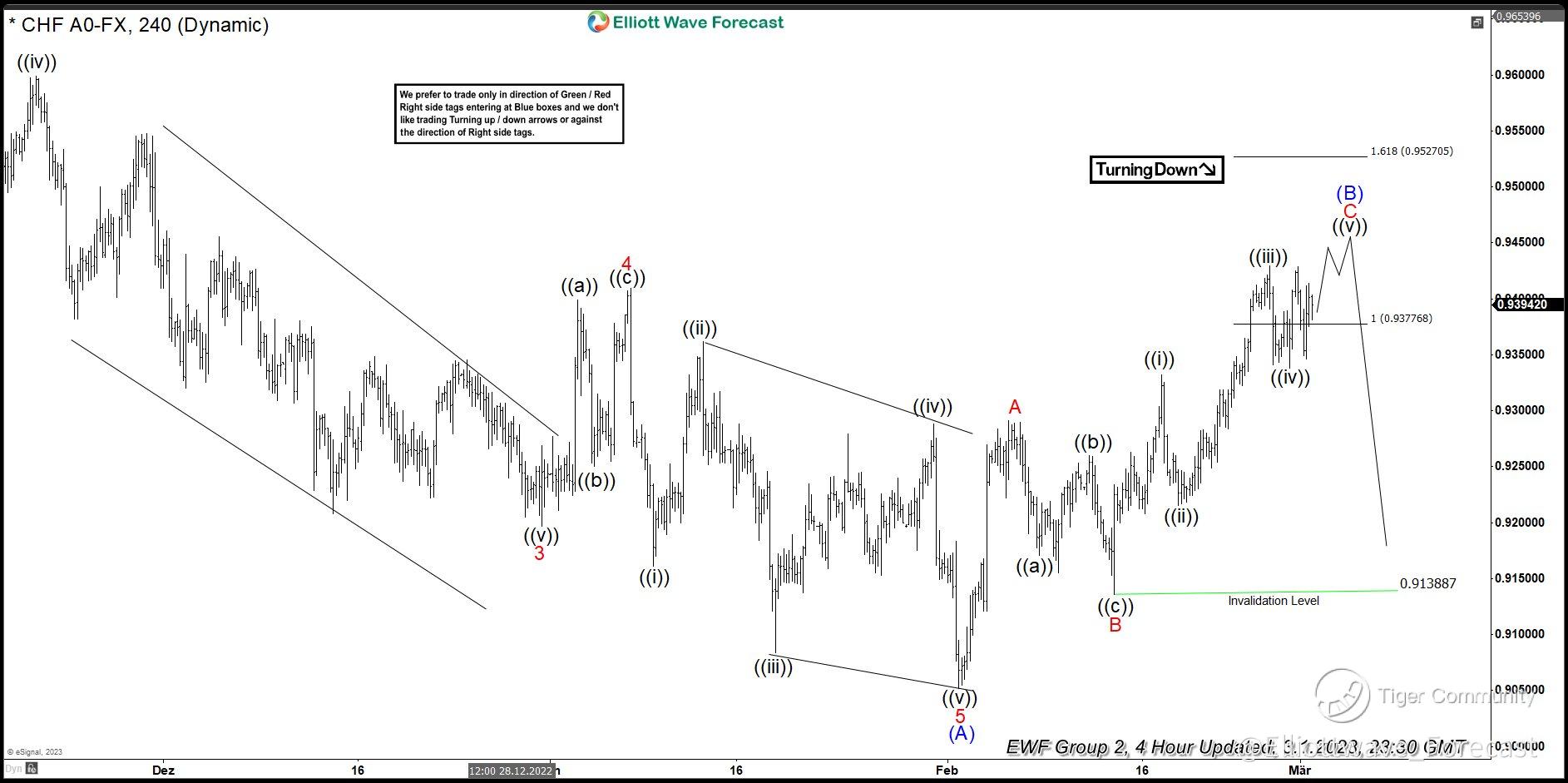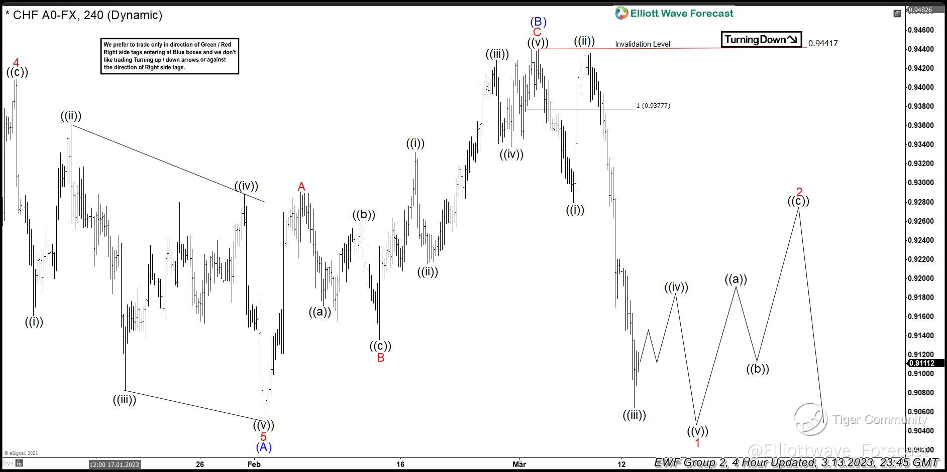 As we can see the pair was trading higher into wave ((v)) of C of (B) within the equal legs area of 0.93777 – 0.95270. This indicated that soon when wave ((v)) ends we should see the reaction lower from the area. Ideally wave (C) lower should get started. Now let’s see what happened next looking at USDCHF 4 hour chart from today’s update of 03.13.2023