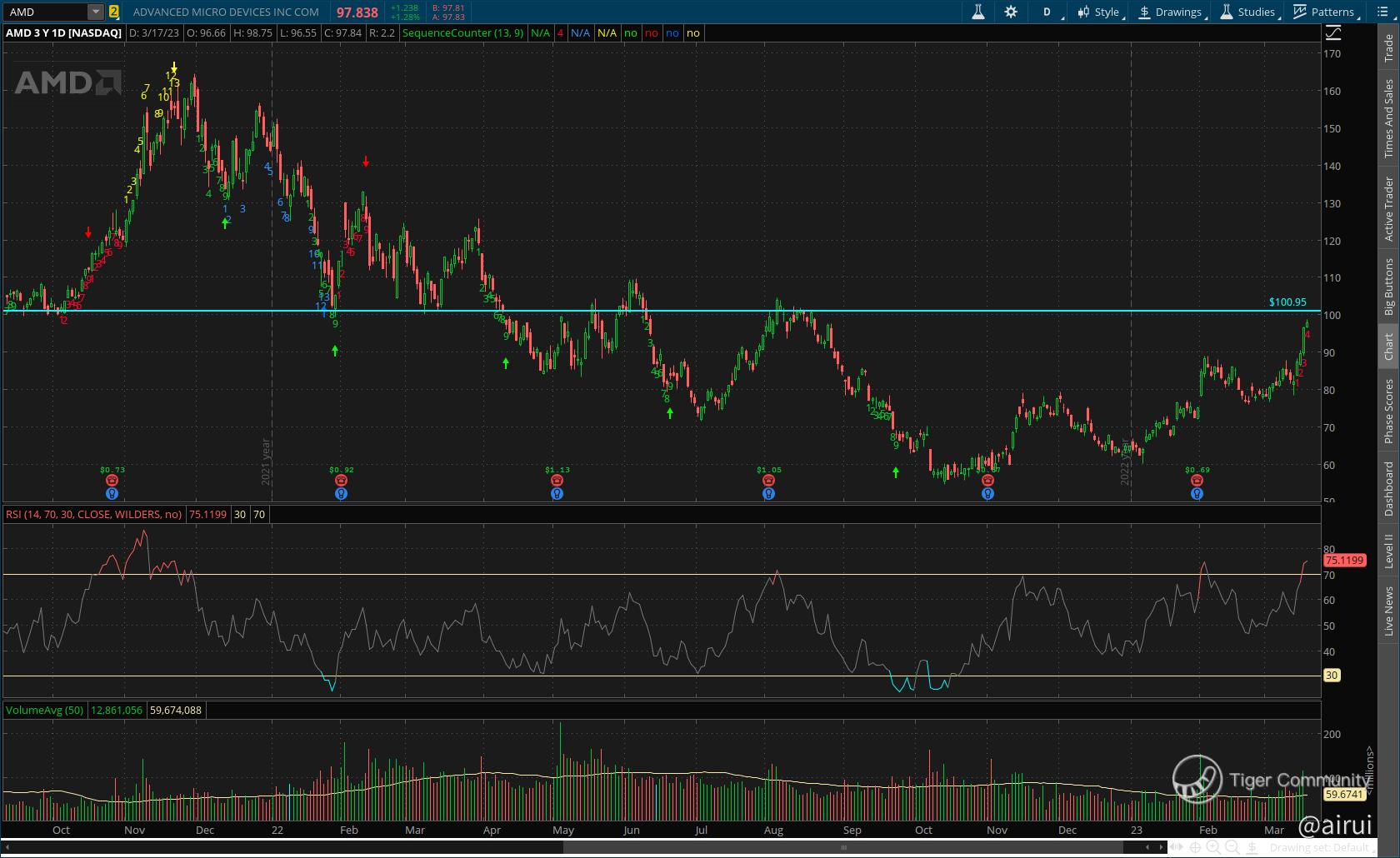 Based on the day chart below, AMD's current resistance is around $100, and it has struggled to break above this level in the past. The relative strength index (RSI) for AMD is above 70, indicating that the stock is in the overbought region. It's also essential to compare the performance of AMD with the broader market. Usually for TECH stock, I will want to look at the Invesco $Invesco QQQ Trust(QQQ)$ QQQ Trust (QQQ), which tracks the performance of the NASDAQ 100 index. Currently the RSI of QQQ is above 60, although it is not yet in the overbought region, the upside may be limited.