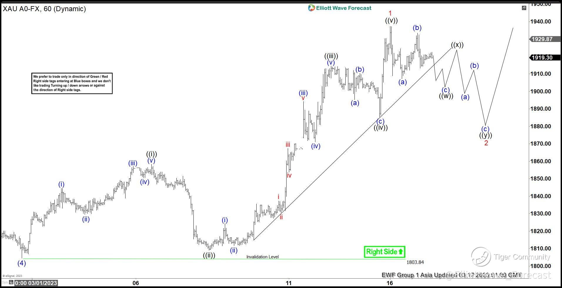 Wave 2 pullback is now in progress to correct cycle from 2.28.2023 low in larger degree 3, 7, or 11 swing before the rally resumes. Wave 2 is proposed to be unfolding as a double three Elliott Wave structure. Down from wave 1, wave (a) ended at 1907.1 and wave (b) rally ended at 1933.42. While below wave 1 at 1937.31, expect Gold to extend lower in wave (c) of ((w)). Afterwards, it should rally in wave ((x)) before turning lower again in 3 waves to end wave ((y)) of 2. If Gold breaks above 1937.31 instead, then that means Gold is still in the process of ending wave 1. Near term, as far as pivot at 1803.84 low stays intact, expect dips to find support in 3, 7, or 11 swing for further upside.