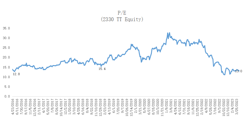 On a price-to-earnings basis, TSMC PE(TTM) trades at 13 times, which is the lowest in the past seven years: