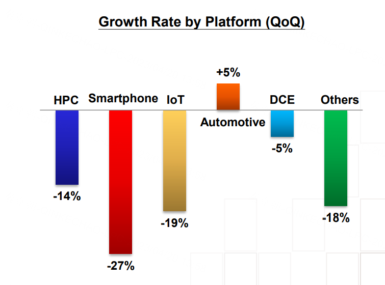 On a sequential basis, except for the slight growth of automotive chips, all other products showed a sharp decline, especially smartphones and HPC (high performance computing) performance: