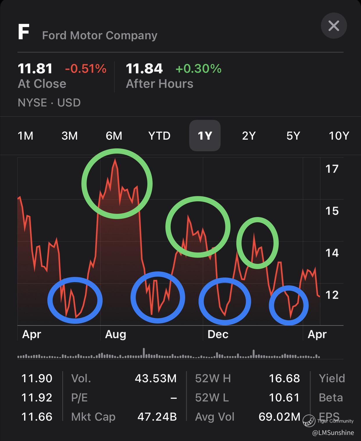 As for me, I like to 💪📈🏃♀️🏃♂️Only Chase Hot Stocks That Are Solid Investments😉 I find that this method helps me the most in preserving capital while allowing me to make good profits. For example, in the automotive industry, $Ford(F)$ would be a solid investment whereas $Tesla Motors(TSLA)$ Bearish would be more of chasing a hot trend (although die-hard fans of TSLA wouldn’t agree with me😅) Let’s compare their stock charts for the last 1 year & analyse together🕵🏻♀️🕵🏻♂️: