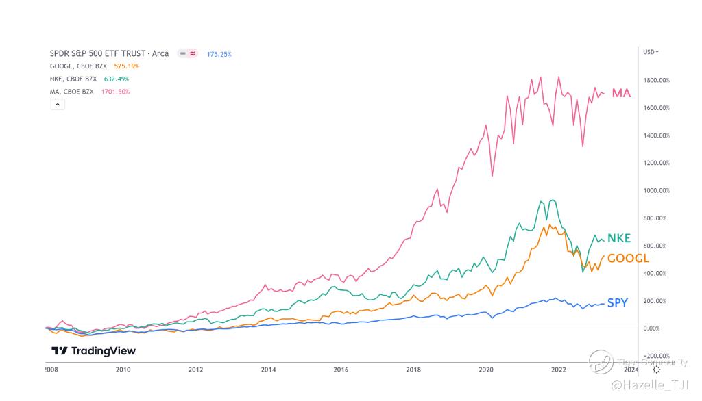 And if we compare the long term performance of the S&P 500 index against names like Google, Nike, Mastercard and Costco, these quality stocks generally outperform the S&P 500 over the long run.