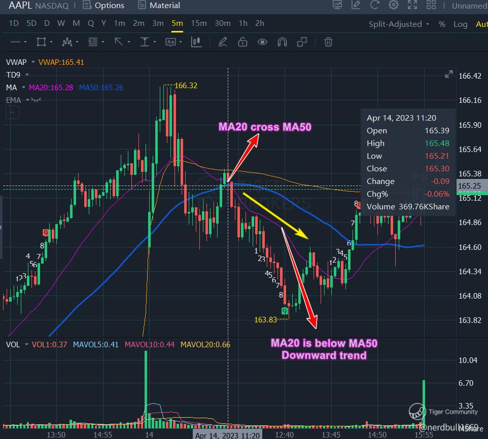 Here we see a clear example of a 20/50 day moving average crossover in Apple: