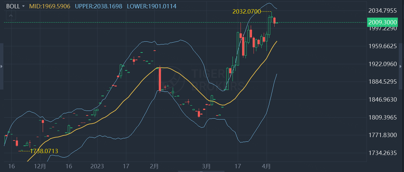 週三(4月5日)“小非農”數據發佈後,就業壓力顯示經濟下滑,市場對美聯儲暫停加息以及降息的預期顯著升溫,這打壓美元與美債收益率,美元指數快速下跌,黃金價格大幅上漲,國際金價一度飆升到2022 年3 月以來的最高水平,價格一度突破每安士2000美元,甚至觸及到2032美元/盎斯,收2022美元/盎斯。