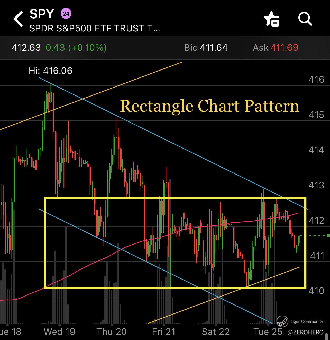 SPY has been consolidating for a few days since last week. The price is squeezed by the top blue line and the bottom yellow line to form a symmetrical triangle. The rectangle chart pattern can be identified with the support and resistance as highlighted above.