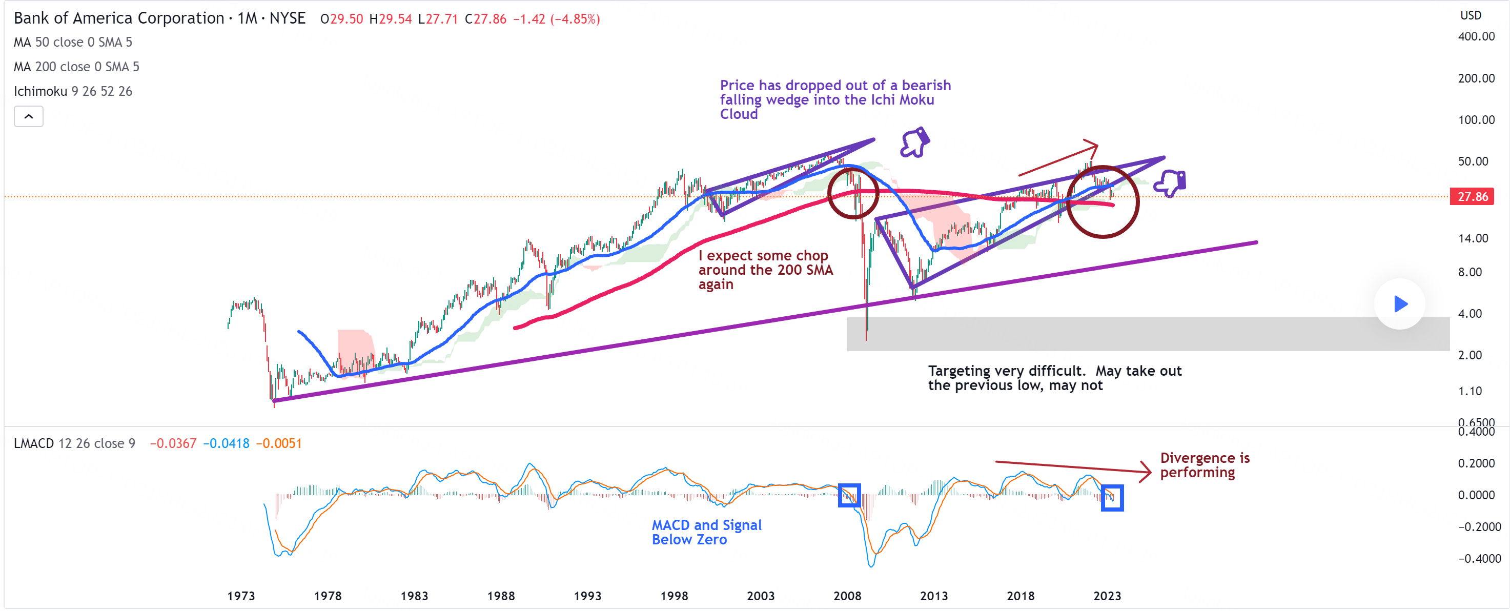 The Bank of America Corporation is one of the most famous of Warren Buffets holdings. It is right behind Berkshire’s Apple holdings in size and it has only grown during the recent banking turmoil. This is while he is “dumping” other banks because of red flags in their financials. That is beginning to look like a bad decision based on the technical of $Bank of America(BAC)$ .