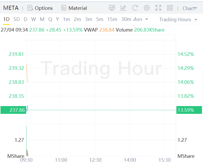 $Meta Platforms(META)$ Inc. surged over 13% in morning trading after reporting first-quarter revenue that exceeded analysts’ estimates and signaling the beginnings of a recovery in digital advertising.
