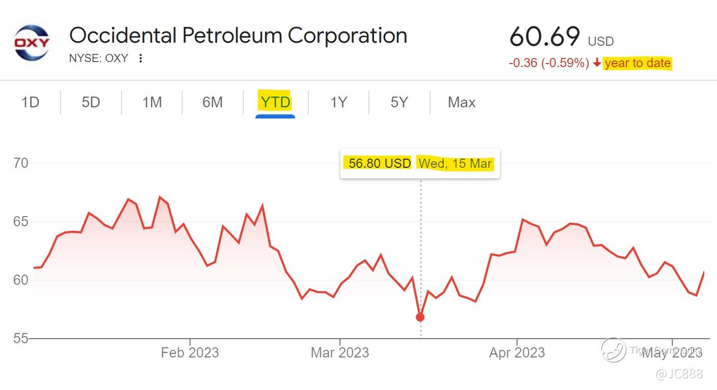 Occidental Petroleum was up +3.39% ($1.99) last Fri, 5 May to $60.69 per share.