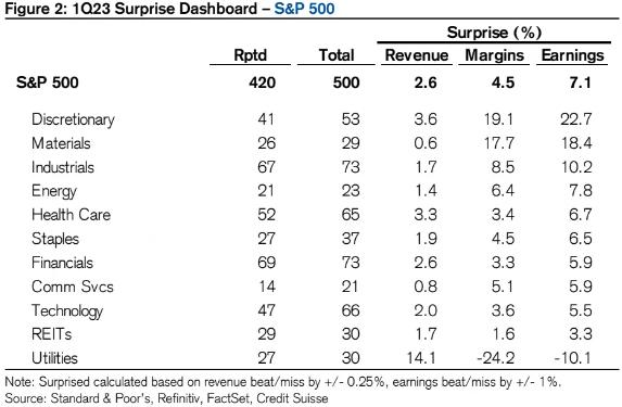 According to Credit Suisse's statistics, as of May 5th, 420 companies in the $S&P 500(.SPX)$ have announced their latest earnings, of which 74% have exceeded expectations, with an average surprise rate of 7.1%, which is much higher than the 4.2% in the past five quarters.