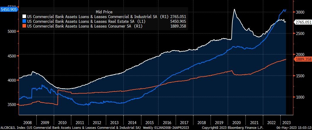Overall credit growth in the US has indeed stalled amid the banking storm, but the total remains at a high level. US commercial bank assets loans & leases Real Estate SA (blue line, left axis) and US commercial bank assets loans & leases Consumer SA (orange line, right axis) are both at new highs, while US commercial bank assets loans & leases Commercial & Industrial SA (white line) have declined.