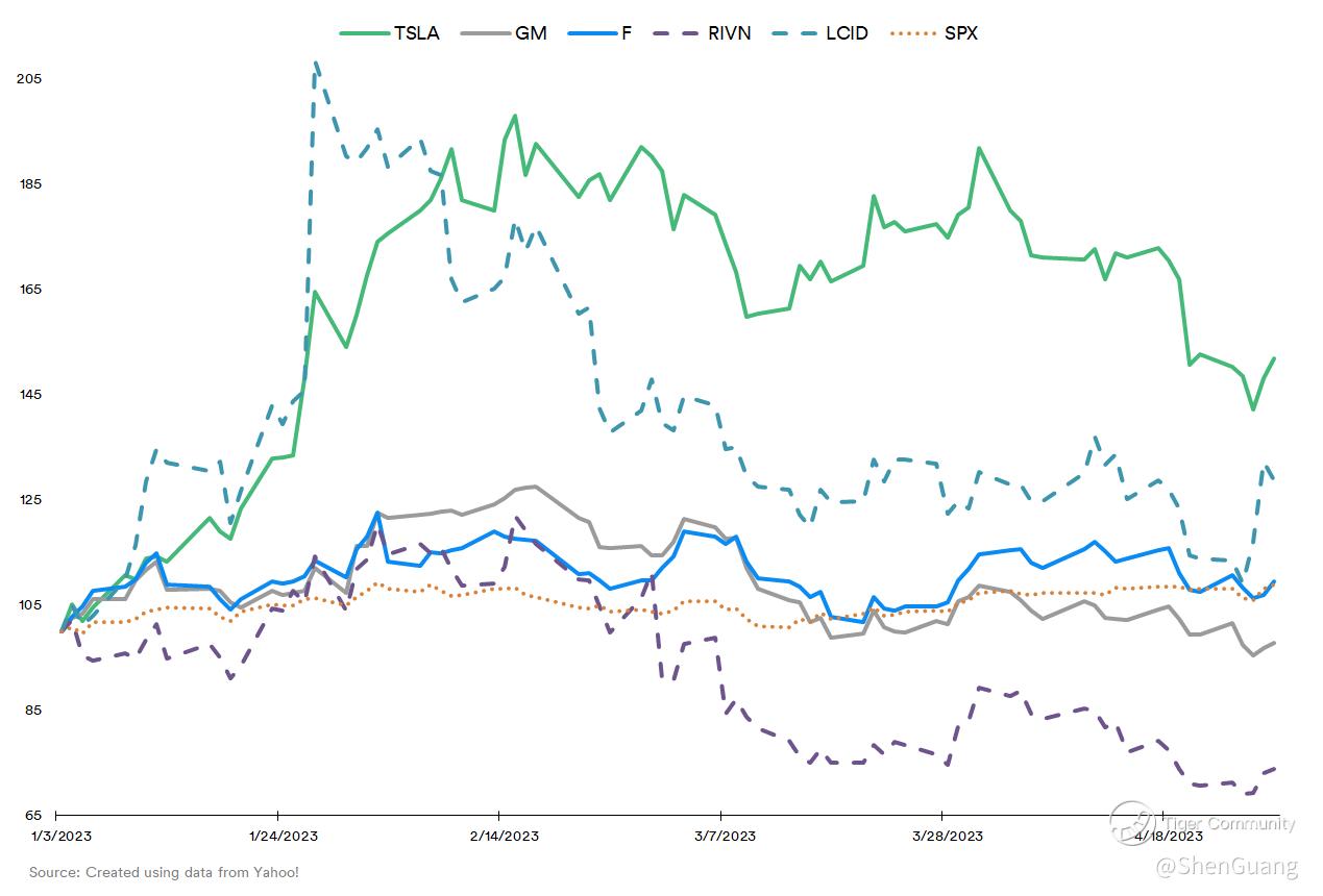 Data suggests that Tesla has been a strong directional outlier in the months leading up to April. However, April has been a depressor for 4 out of the 5 U.S. carmakers. Such a large proportion of this basket suffering a reversal is indicative of industry-wide gloom on the sales outlook: with price cuts being the way forward to keep short-term demand going, virtually every carmaker is expected to get hit on margins. However, relative to "pure play" carmakers, "diversified" legacy carmakers are tending to maintain a stronger and less volatile trajectory relative to the index.