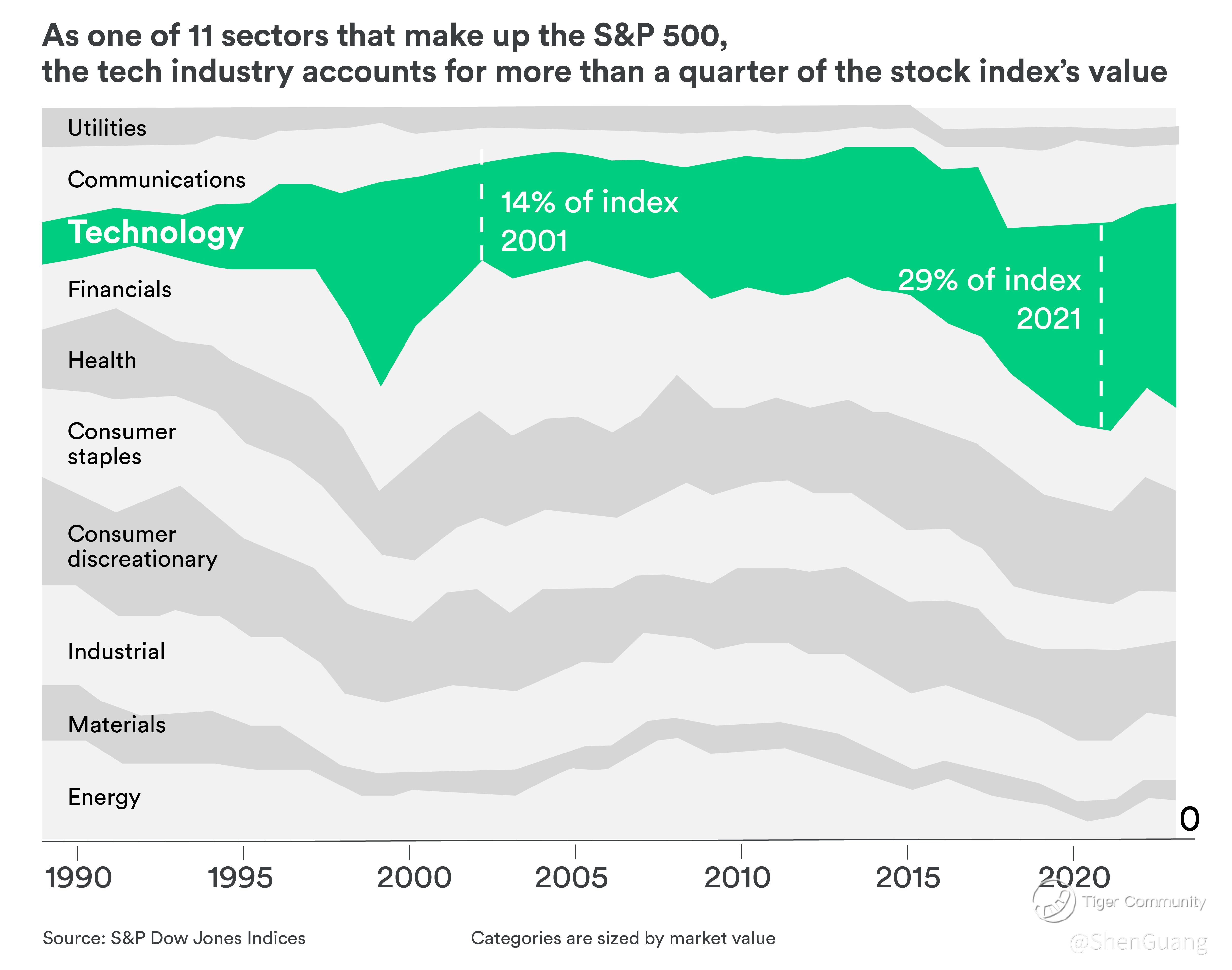 The preponderance of Big Tech in the Top 25 - and its relative impact on the economic bellwether - has been increasing over the past years. "Technology" had gone from comprising a little under 15% of the S&P 500 to nearly a third.