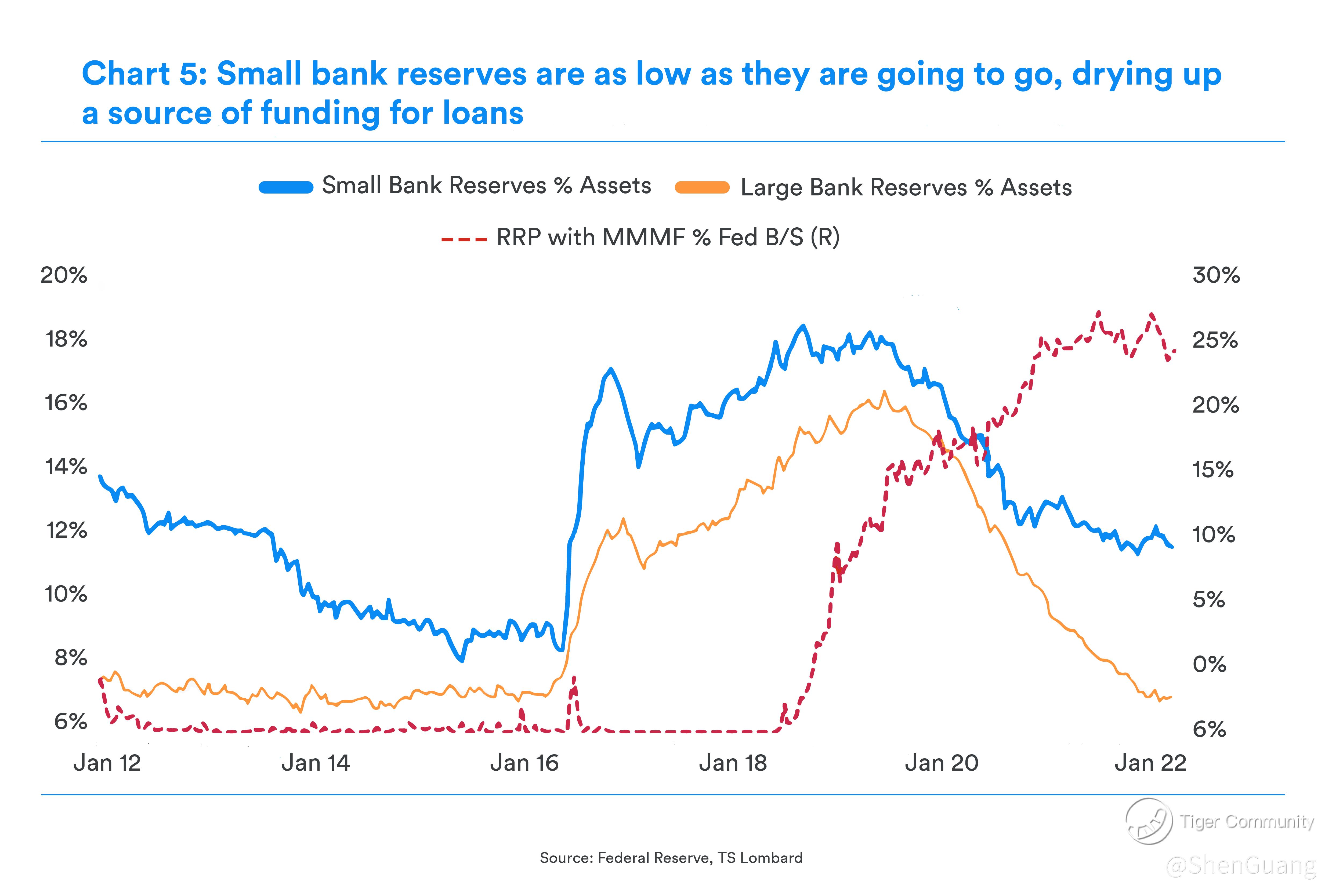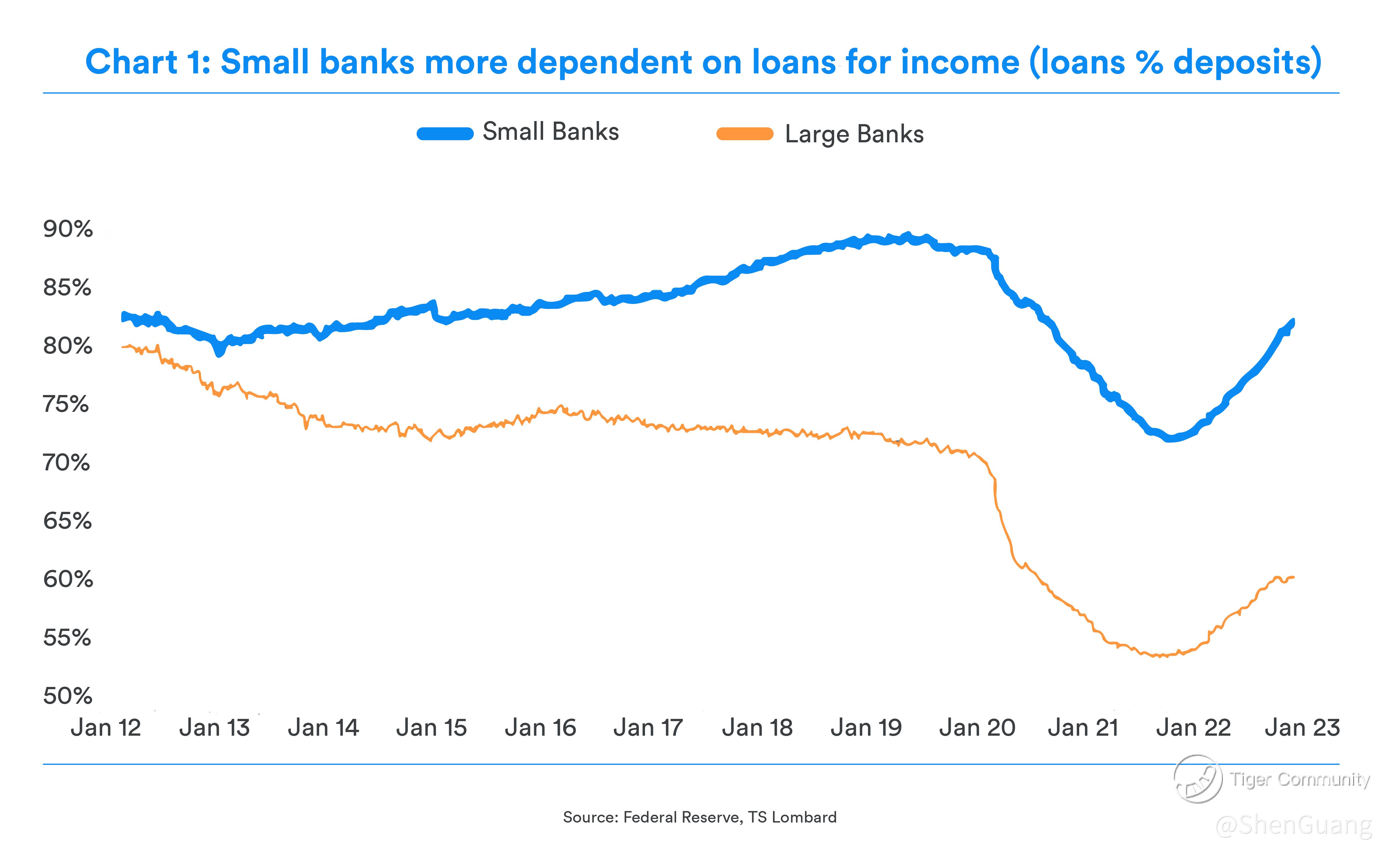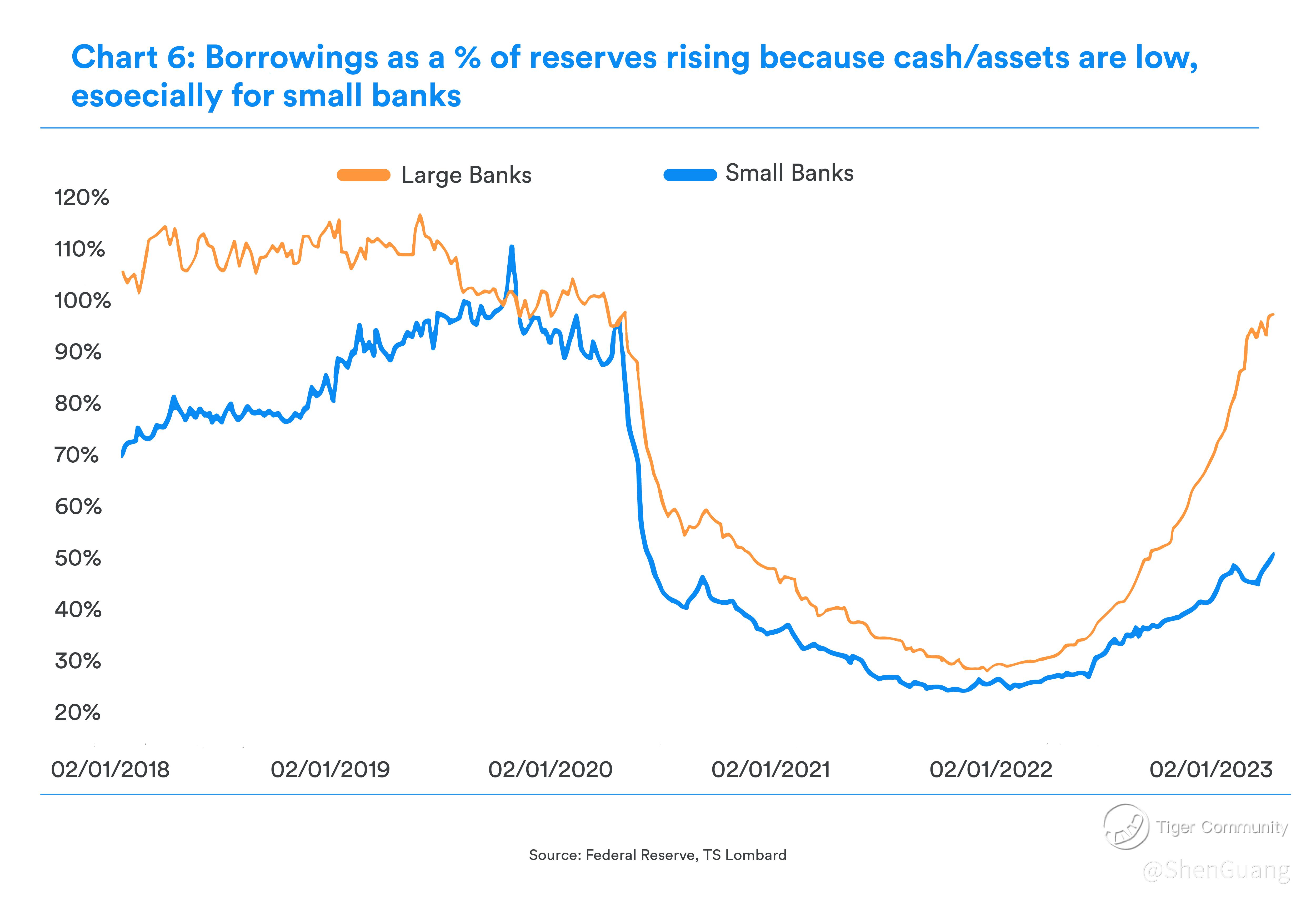 Global macroeconomic consultancy TS Lombard published that, as of January this year, small banks in the U.S. were critically low on deposits and had starkly low liquid reserves.