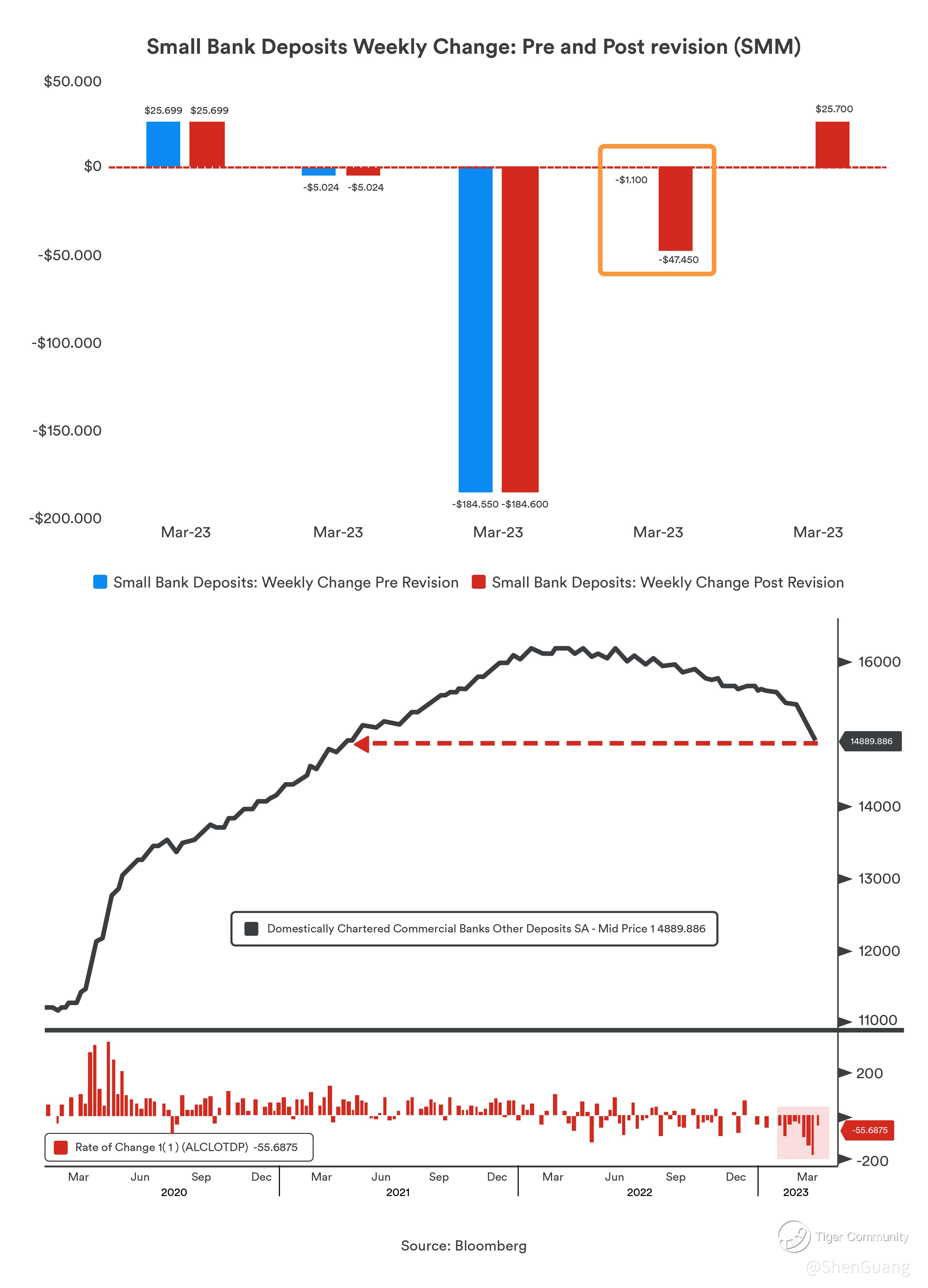 Small banks were heavily dependent on loans contributing to their balance sheet at a time when lending activity was heavily distressed. In the midst of the collapse of Silicon Valley Bank and Signature Bank, the entire financial sector was under a lot of pressure. Small banks saw a massive drop in weekly deposits through the course of March, which hadn't fully recovered by the end of the month.
