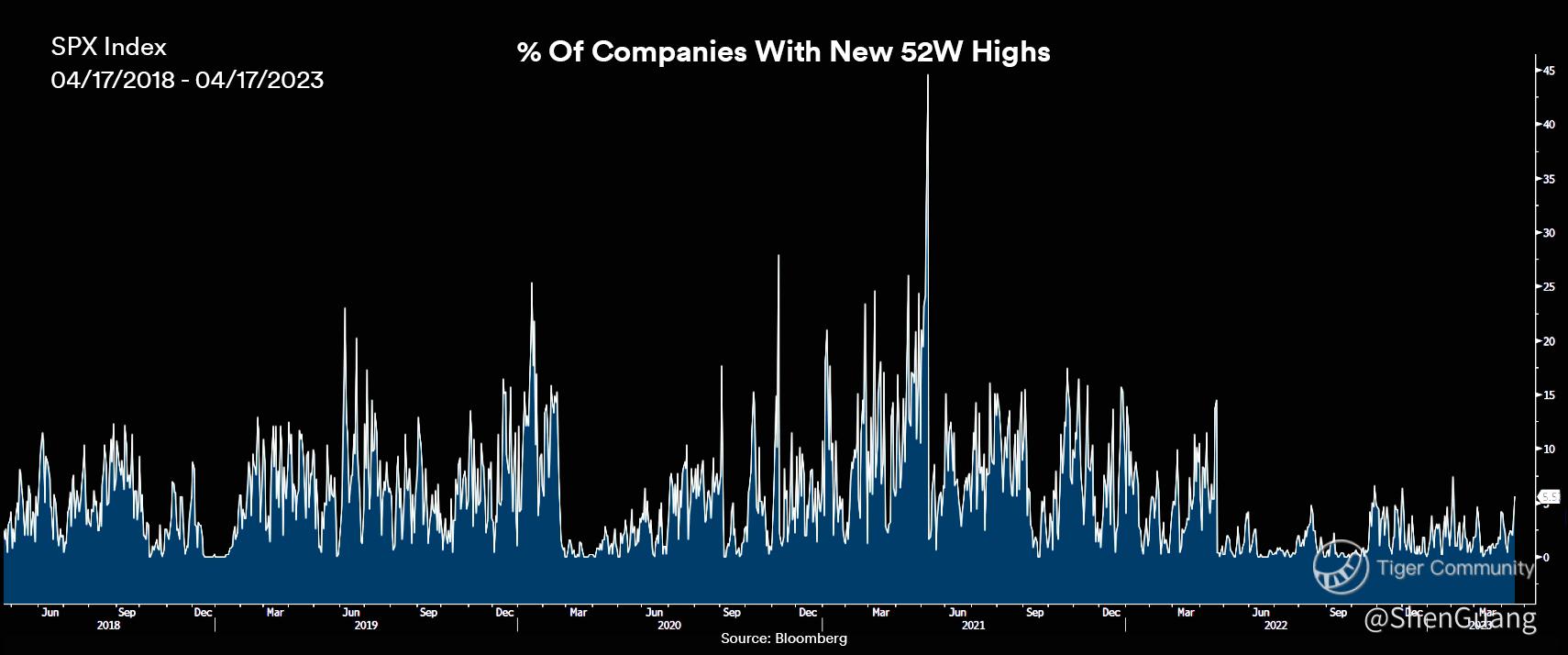 Bearing in mind the concentration of overall trajectory into the top of the line of the S&P 500, it's also germane to note that the number of companies hitting new 52-week highs is at 5-year lows: