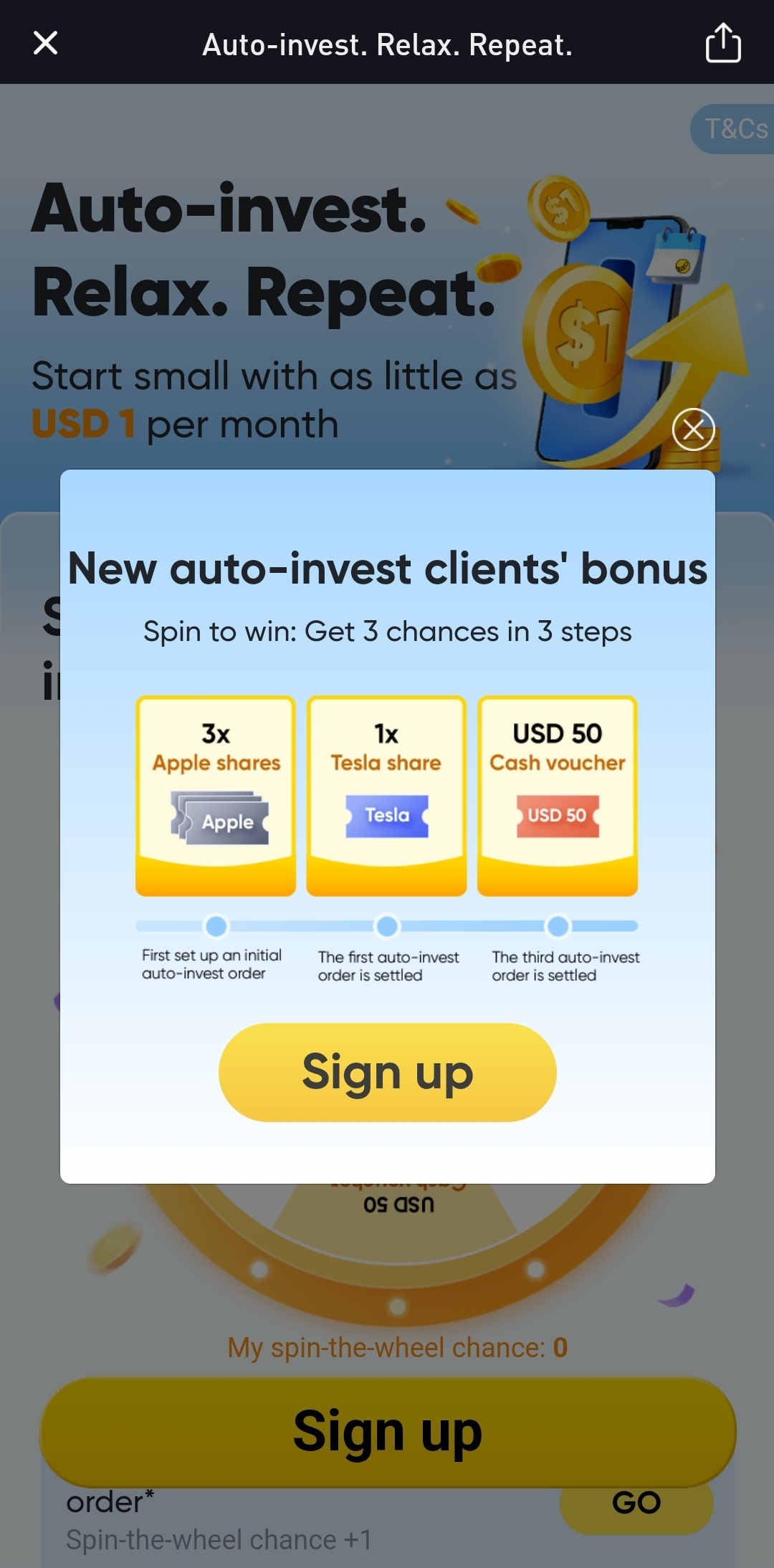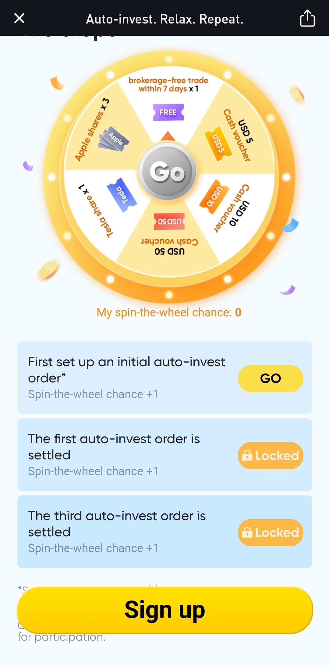 I was day dreaming if "maybe" I can get 3x $Apple(AAPL)$ shares or 1$Tesla Motors(TSLA)$ share through this promo[Thinking] +[Helpless] =[Sly] ? Minimum 50 USD voucher?