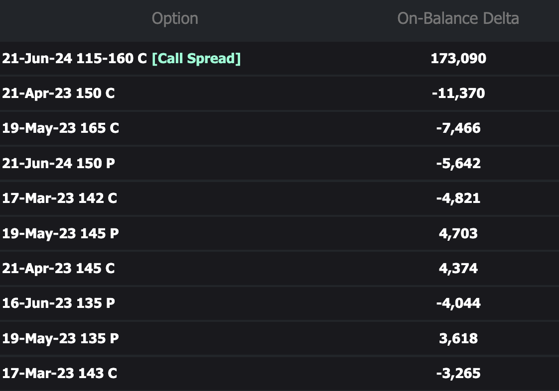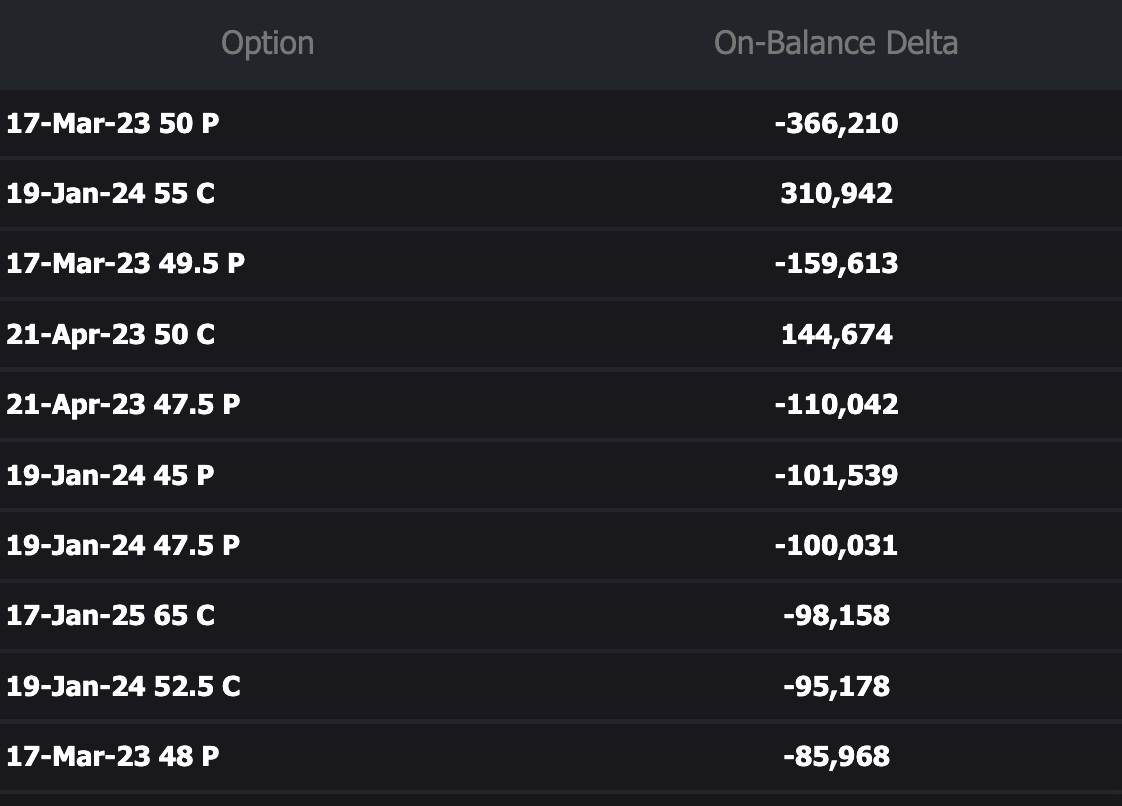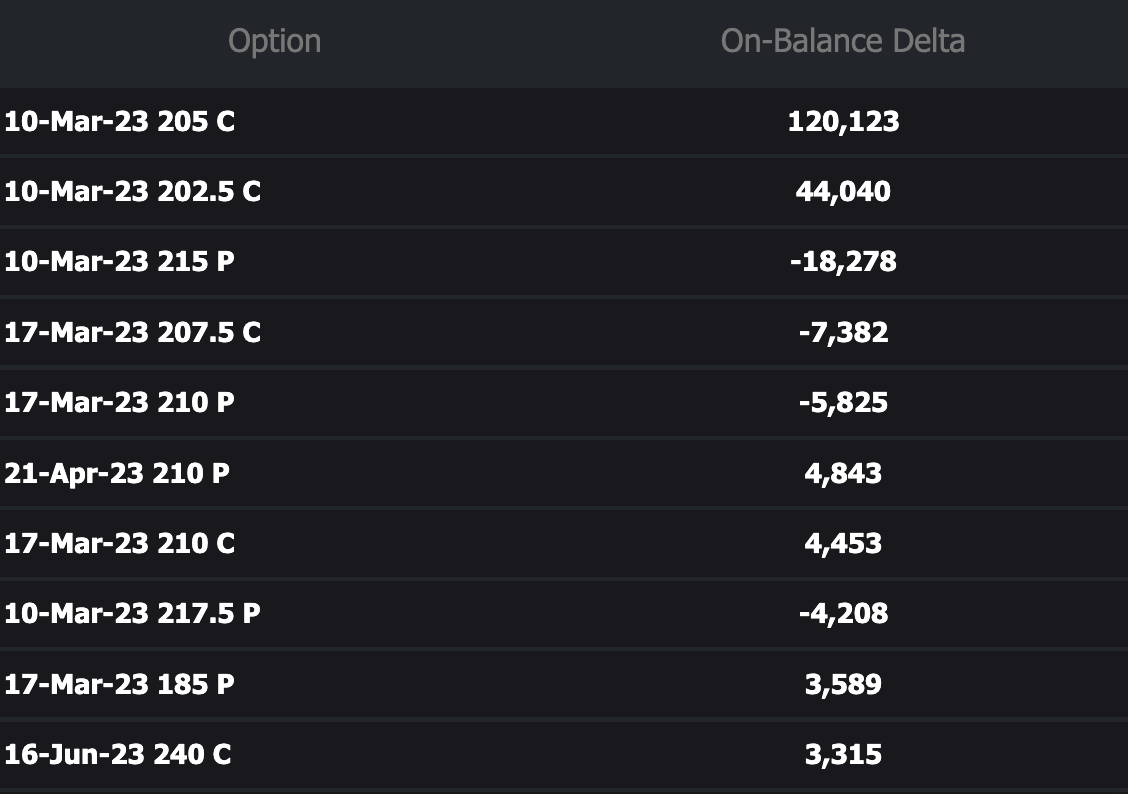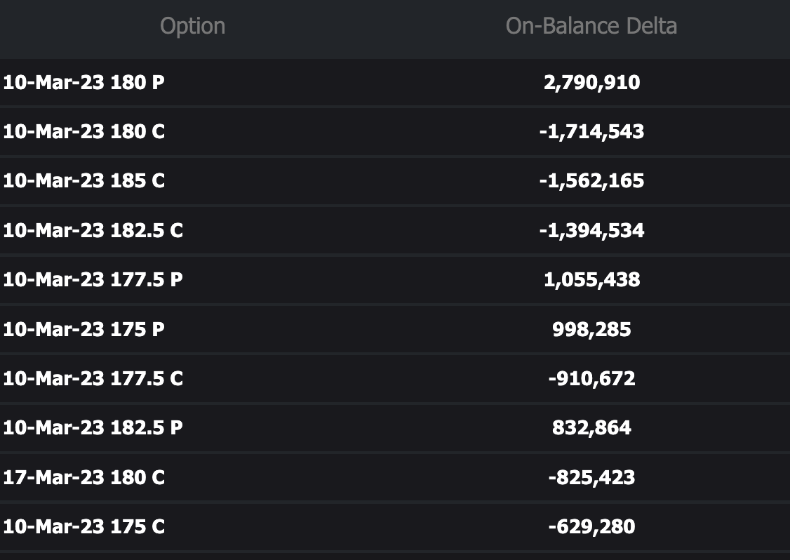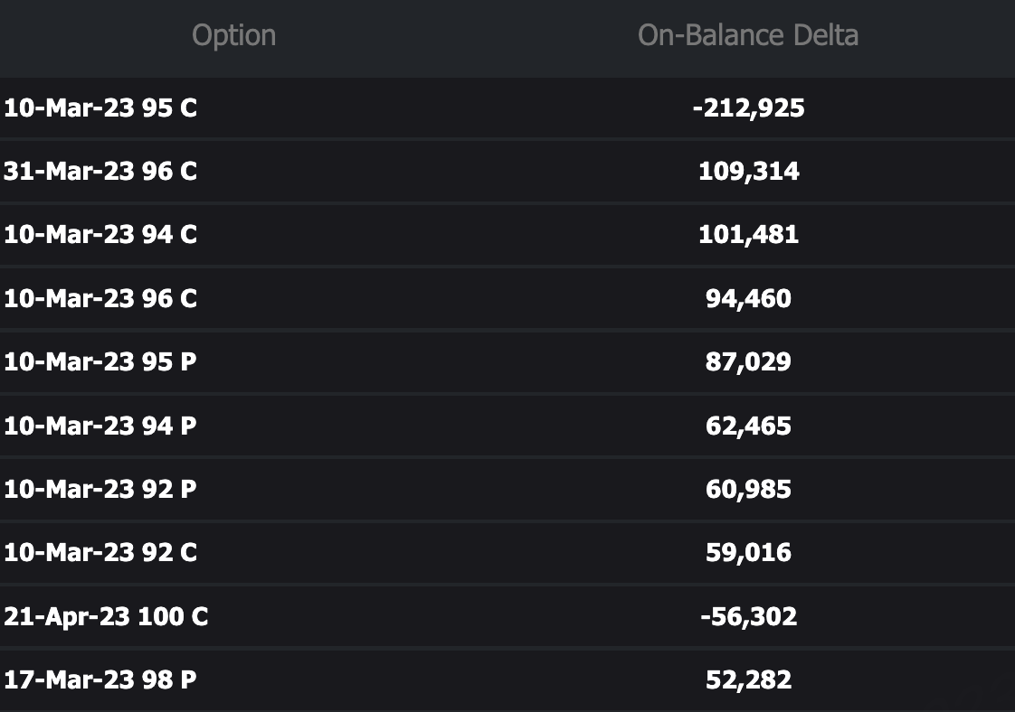 And a list of the top 10 option contracts by options delta volume. It helps you quickly find which expirations and strikes traders are targeting. And you can easily see if traders are focusing mostly on calls, puts or even rotating into or out of one option to another.