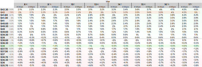 觀察起手式完成後的損益模型圖,若我們用 Covered call 的點位當作獲利的目標,可以看到 3/17 的那天這個獲利點(上圖的橘色框中)的報酬大約與股價本身的成長獲利比率相當,這樣就是全賺!