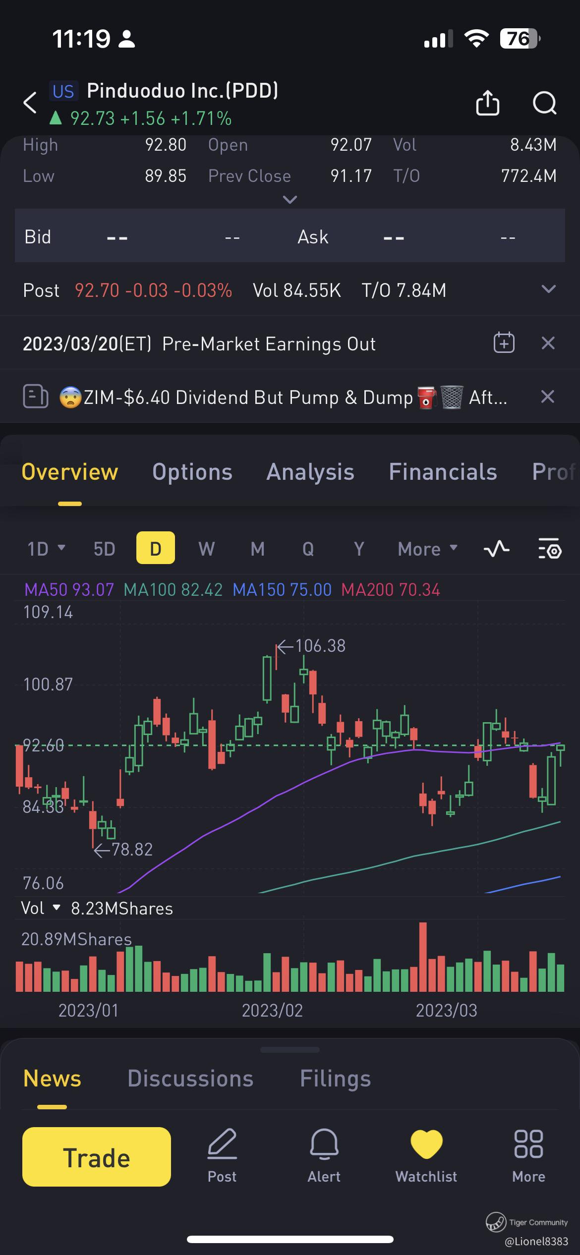 Today's trade to look out for would be $Pinduoduo Inc.(PDD)$ , as it has made a strong bounce off support level $85 and daily MA 100.