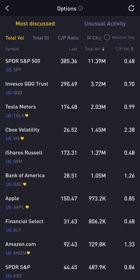 Top 10: SPY, QQQ, TSLA, VIX, IWM, BAC, AAPL, XLF, AMZN, KRE