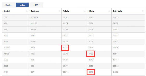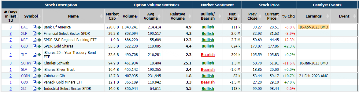This report shows stocks with the highest volume of bullish and bearish activity by option delta volume, which converts option volume to an equivalent stock volume (bought or sold).