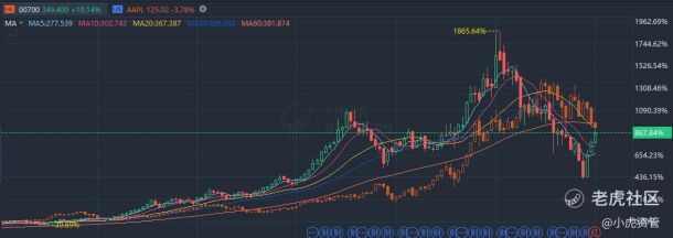 In the first week of 2023, two giants of US and HK stock market - the declining $Apple(AAPL)$ (orange K-line) and the bottom-bouncing $TENCENT(00700)$ (red and green K-line) converge in terms of their 10-year returns.